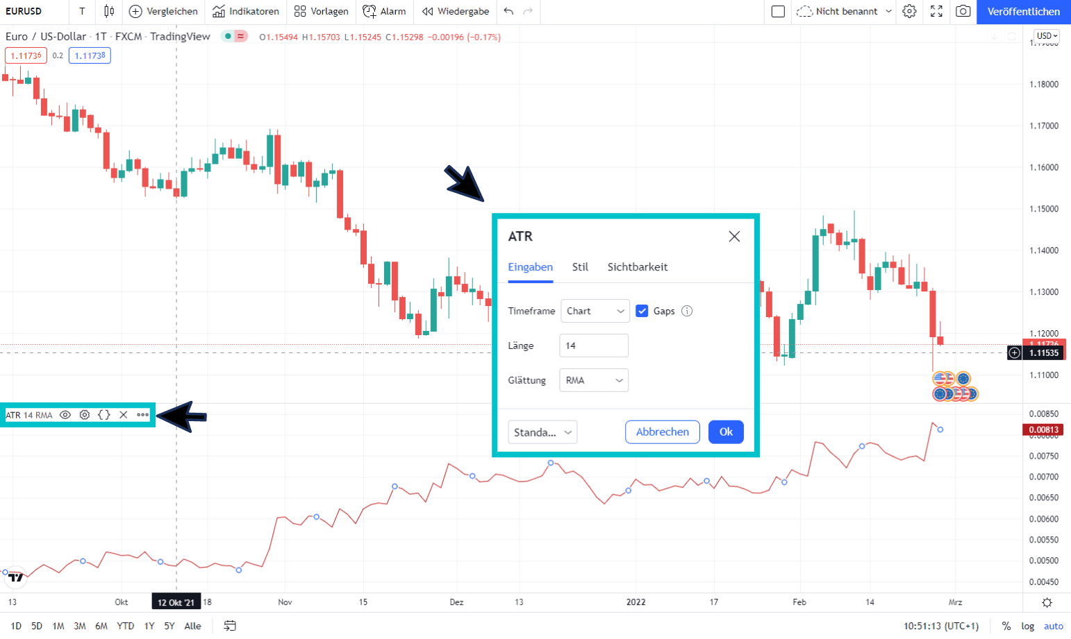 • Der für die ATR zu verwendende Zeitraum kann frei gewählt werden. Bei Tradingview sind 14 Perioden voreingestellt. Sinnvoll ist in den meisten Fällen ein Betrachtungszeitraum von 14 Tagen.