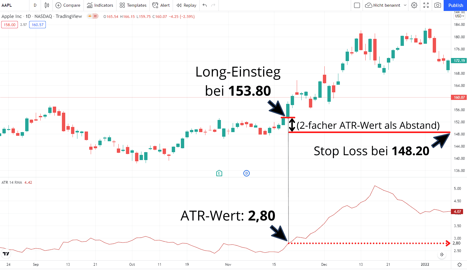 In diesem Beispiel erfolgt der Einstieg bei der Apple Aktie bei 153.80. Der ATR-Wert befindet sich zu diesem Zeitpunkt bei 2,80 (wir befinden uns im D1 Chart). Nachdem wir diesen Wert verdoppeln (2-fache Average True Range), erhalten wir einen Wert von 5,60, der uns nun als Abstand zum Einstiegskurs dient.