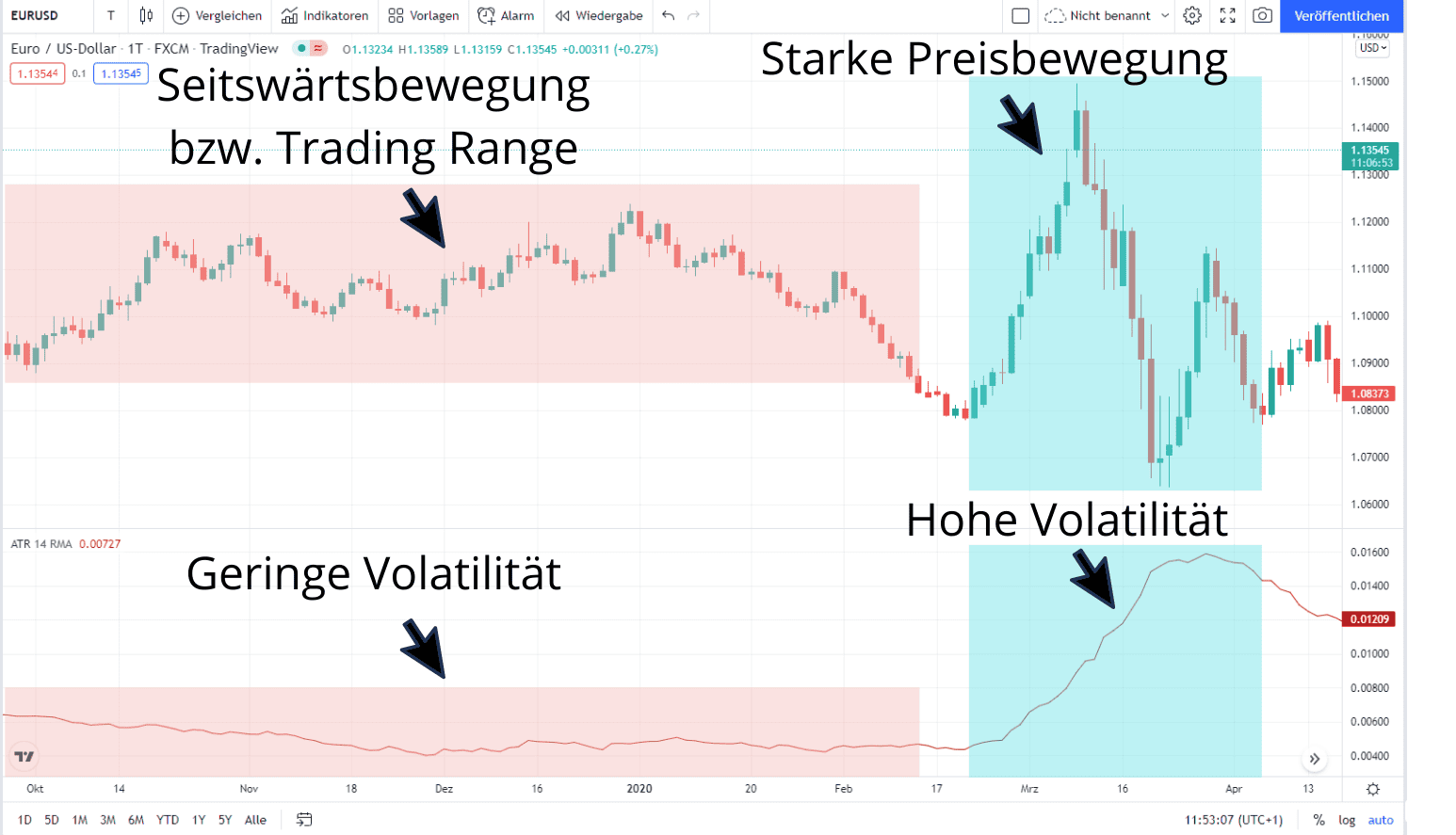 Trading-Chart des EUR/USD-Währungspaares im Tageschart auf TradingView. Das Bild zeigt eine Interpretation des ATR (Average True Range) Indikators zur Volatilitätsanalyse. Links wird eine Seitwärtsbewegung bzw. Trading Range mit geringer Volatilität in einem roten Bereich markiert. Rechts ist eine starke Preisbewegung mit hoher Volatilität in einem blauen Bereich gekennzeichnet. Der ATR-Indikator unten im Chart steigt entsprechend bei hoher Volatilität an und bleibt in der Seitwärtsphase niedrig.