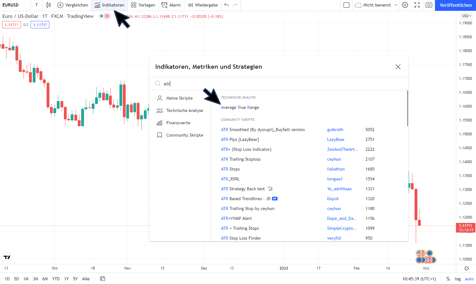 Klicke dafür zunächst auf Indikatoren. In der Suchleiste gibst Du dann “ATR” ein und klickst auf das oberste Ergebnis.
