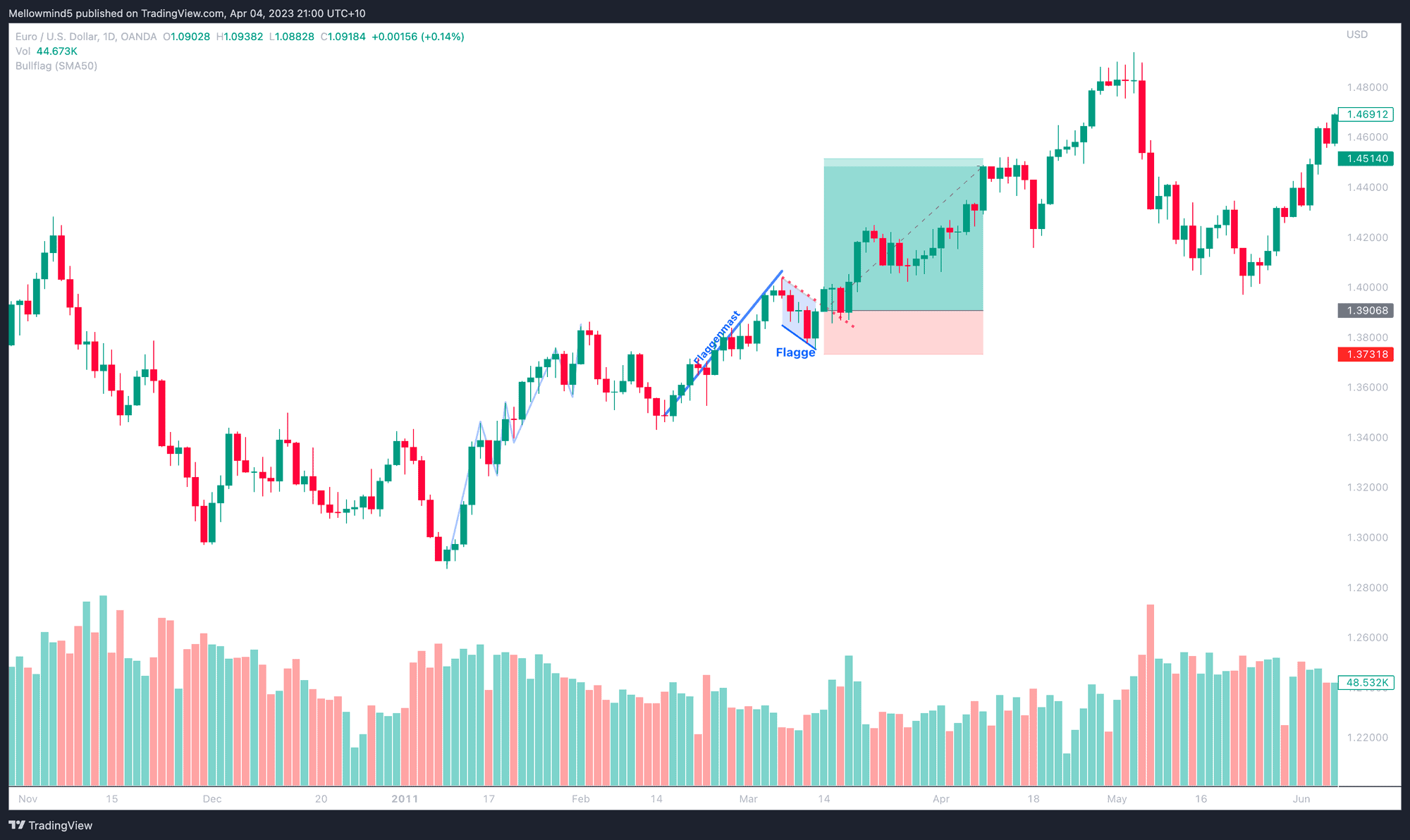 Obwohl das Muster der Bärenflagge ein Signal für eine mögliche Trendumkehr sein kann, ist es wichtig, dass die Bewegung von einem signifikanten Volumen unterstützt wird, um die Wahrscheinlichkeit des Musters zu erhöhen.