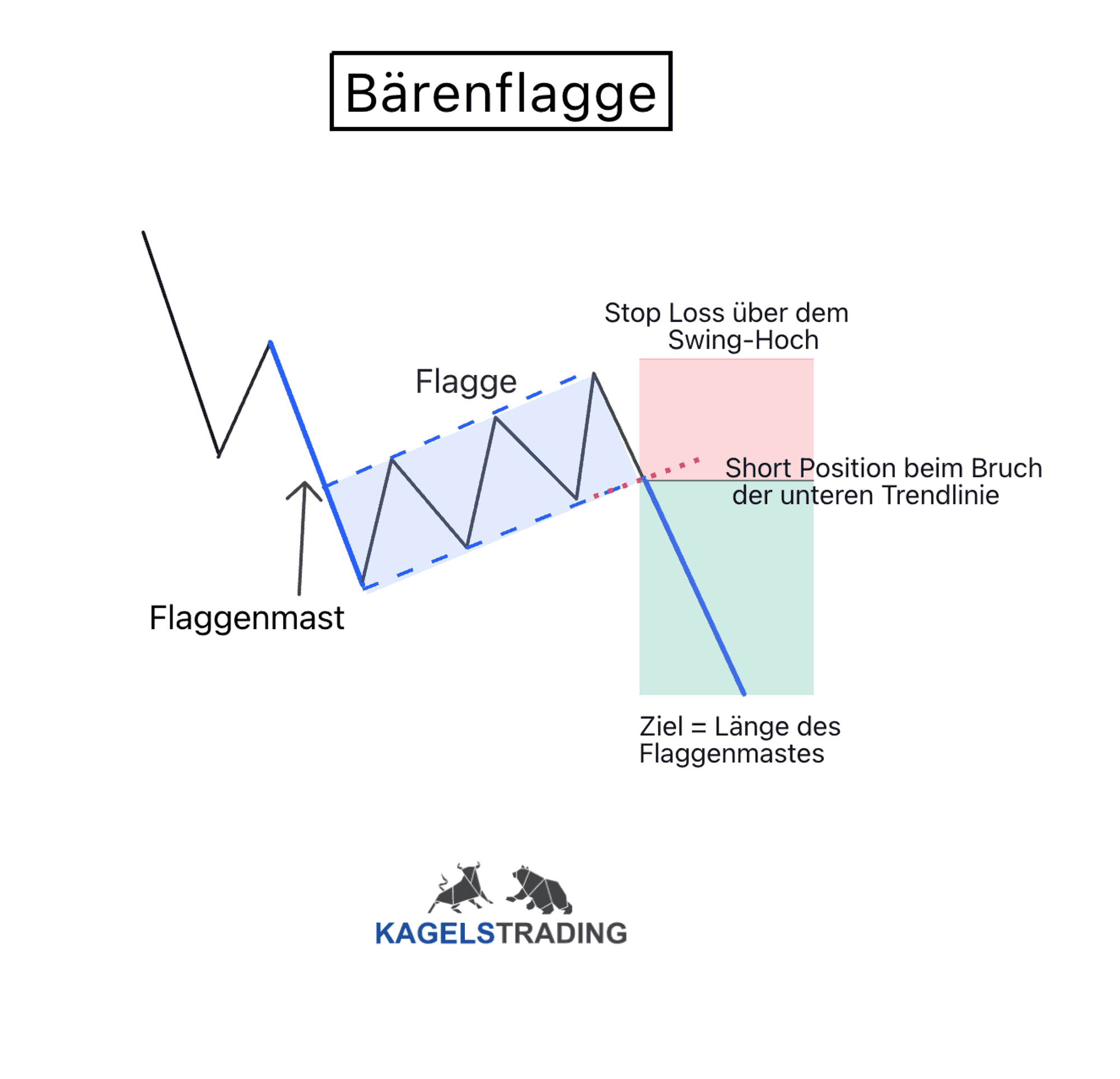 - Eine Short–Position wird eingegangen: Gehe eine Short-Position ein (verkaufen), wenn der Kurs unter die untere Trendlinie fällt, mit einem Stopp-Loss über dem Hoch der Flaggenstange oder der oberen Trendlinie der Bärenflagge.
