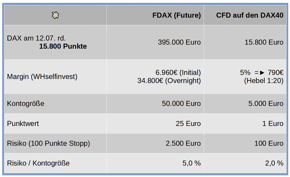 Gewinn oder Verlust beim Handel ermitteln sich aus der Differenz zwischen Eröffnungspreis der Position und dem Ausstiegspreis. Das kann im Verlustfall verheerende Auswirkungen auf das Konto des Traders haben. Der Trader kann ein teures Finanzprodukt – z.B. den DAX-Future – für einen Bruchteil dessen handeln, was er an der Terminbörse kostet.