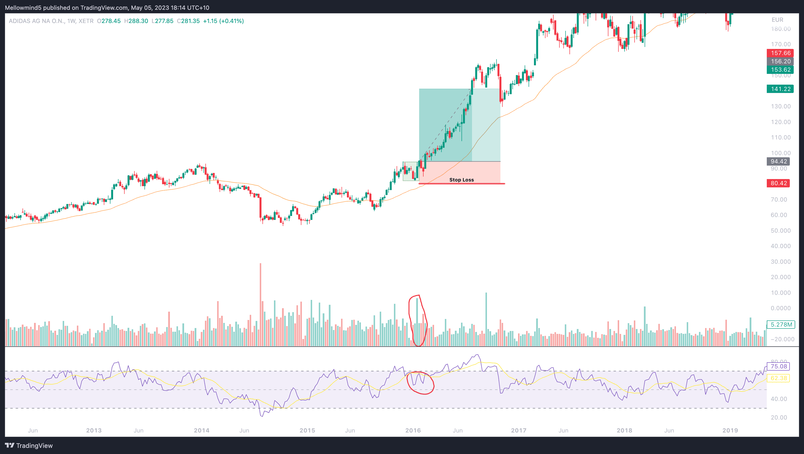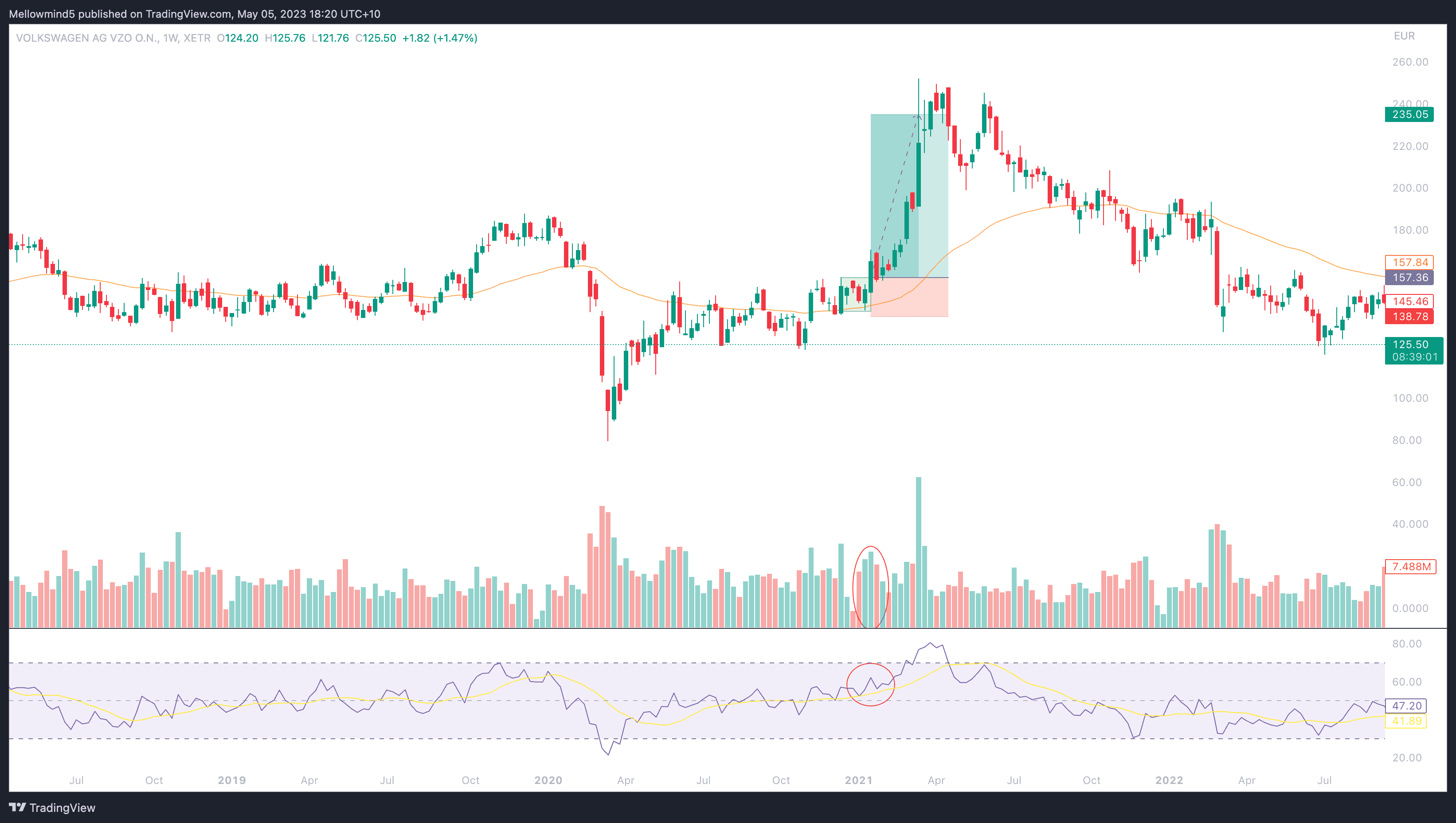Dieses Beispiel der Volkswagen AG (VOW3) zeigt die Effektivität der Darvas Box Handelsstrategie, wenn sie mit anderen Handelstechniken wie gleitenden Durchschnitten und RSI kombiniert wird.