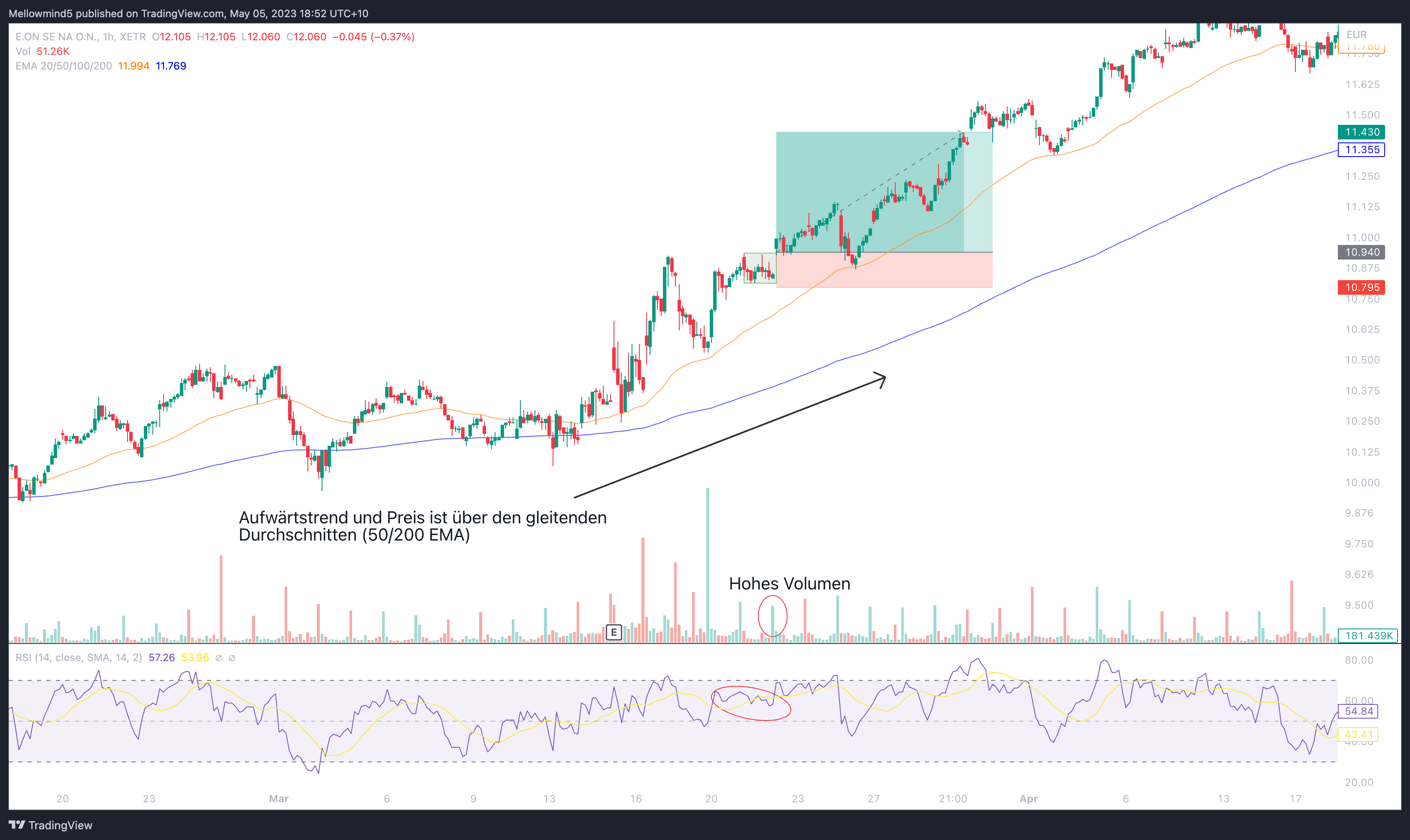 - Gleitende Durchschnitte (Moving Averages): Verwende gleitende Durchschnitte, um die allgemeine Trendrichtung der Aktie zu bestätigen. Eine Aktie, die über dem Moving Average gehandelt wird, kann einen Aufwärtstrend anzeigen, während eine Aktie, die unter ihrem gleitenden Durchschnitt gehandelt wird, einen Abwärtstrend anzeigen kann.