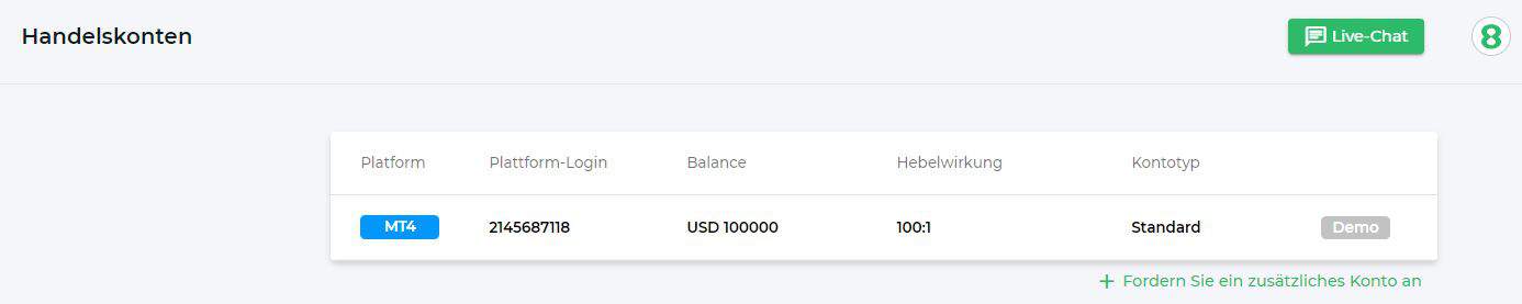 Ja, bei Eightcap gibt es sowohl für MetaTrader 4 als auch für MetaTrader 5 ein Demokonto. Standardmäßig ist dieses für einen Zeitraum von 30 Tagen aktiv. Falls du deine Demophase verlängern möchtest, kannst du eine Anfrage an den Kundenservice von Eightcap stellen. Außerdem kannst du jederzeit ein neues Demokonto eröffnen.