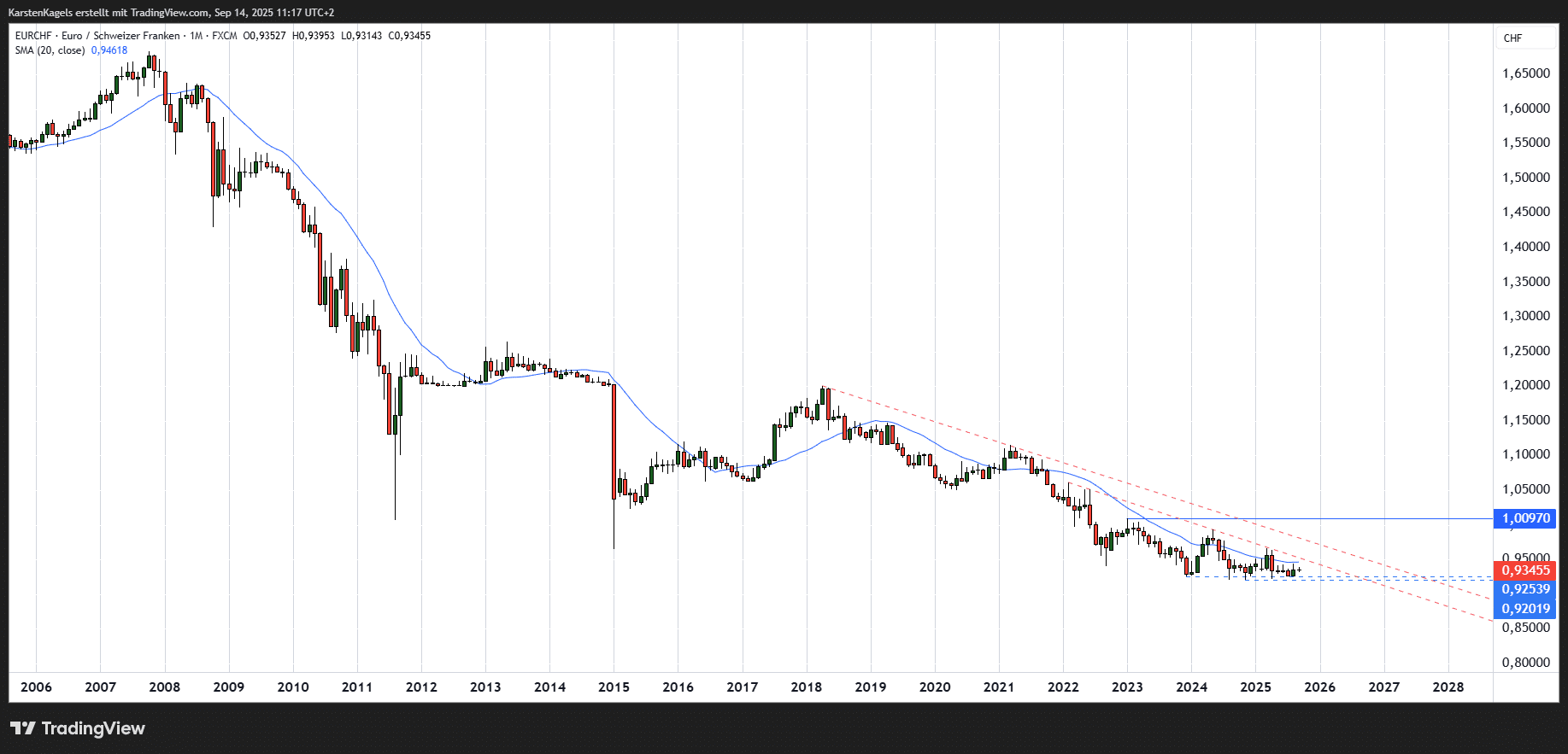 Rückblick: Der langfristige Abwärtstrend des Währungspaares EUR/CHF ist im abgebildeten Monatschart gut zu erkennen. Ausgehend vom 2023er Jahrestief (im Chart bei 0,9253 zu sehen) durchläuft der EUR/CHF eine Seitwärtsphase, die um Stabilisierung ringt.