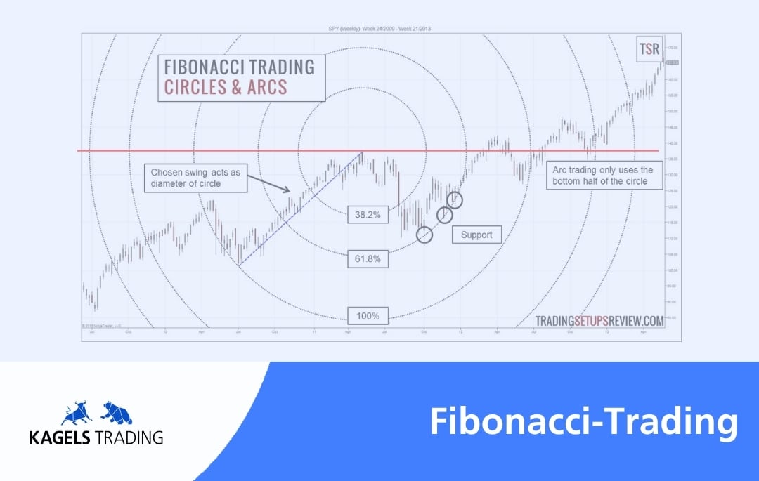 Der Höchstpunkt des Swing fungiert als Mittelpunkt des Kreises. Zeichnen Sie einen Kreis, indem Sie den Swing als Durchmesser verwenden, und damit erhalten Sie die Kreisebene von 100%. Anschließend verwenden Sie die Fibonacci-Verhältniszahlen, um unterschiedliche Diameter für andere Kreisebenen zu berechnen.