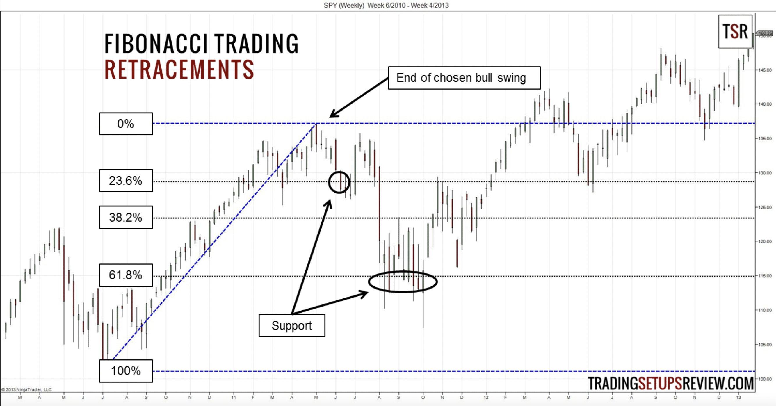 Unabhängig davon, ob die Fibonacci-Zahlen nun magisch sind oder nicht, bieten Sie ein nützliches Bezugssystem zur Analyse der Price Action. So ist beispielsweise das 38,2% Retracement ein oberflächlicher Pullback, während das 61,8% Retracement einem starken Pullback entspricht. Anstatt eine blinde Einordnung der Pullbacks zu vollziehen, haben wir hiermit ein Rahmenkonzept, das uns bei der Einschätzung von Pullbacks behilflich ist.