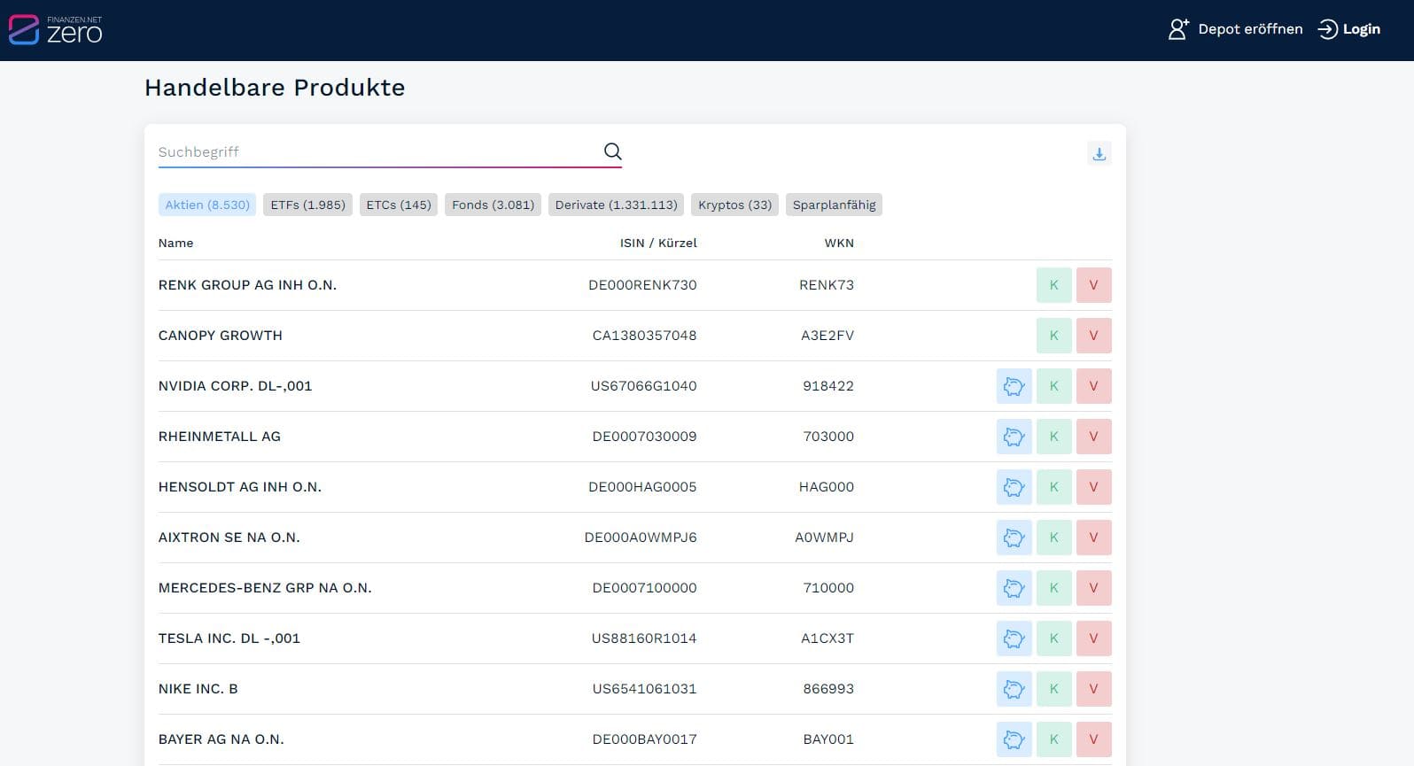 Das Handelsangebot von finanzen.net ZERO umfasst mehr als 8500 Aktien und mehr als 1,3 Millionen Derivate