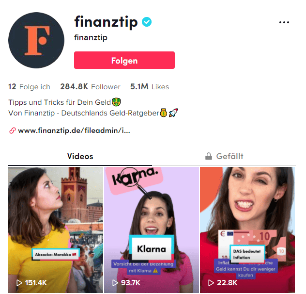 Auf TikTok betreibt Finanztip beispielsweise einen Account mit über 280.000 Followern, auf dem Tag für Tag neue Clips zum Thema Finanzen veröffentlicht werden. Derzeit verantwortlich für den Inhalt auf TikTok ist ebenfalls Sophie Linder, welche auch in den Clips zu sehen ist. Fast jeder Clip erzielte bisher über 100.000 Views.