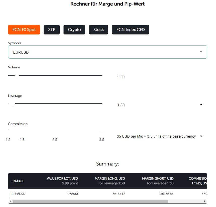 Eine Besonderheit bei FXOpen ist zudem der integrierte Rechner für Margen und Pip-Werte, den du unter „Trader-Tools“ findest. Hier kannst du unter anderem die Provisionen exakt ausrechnen.