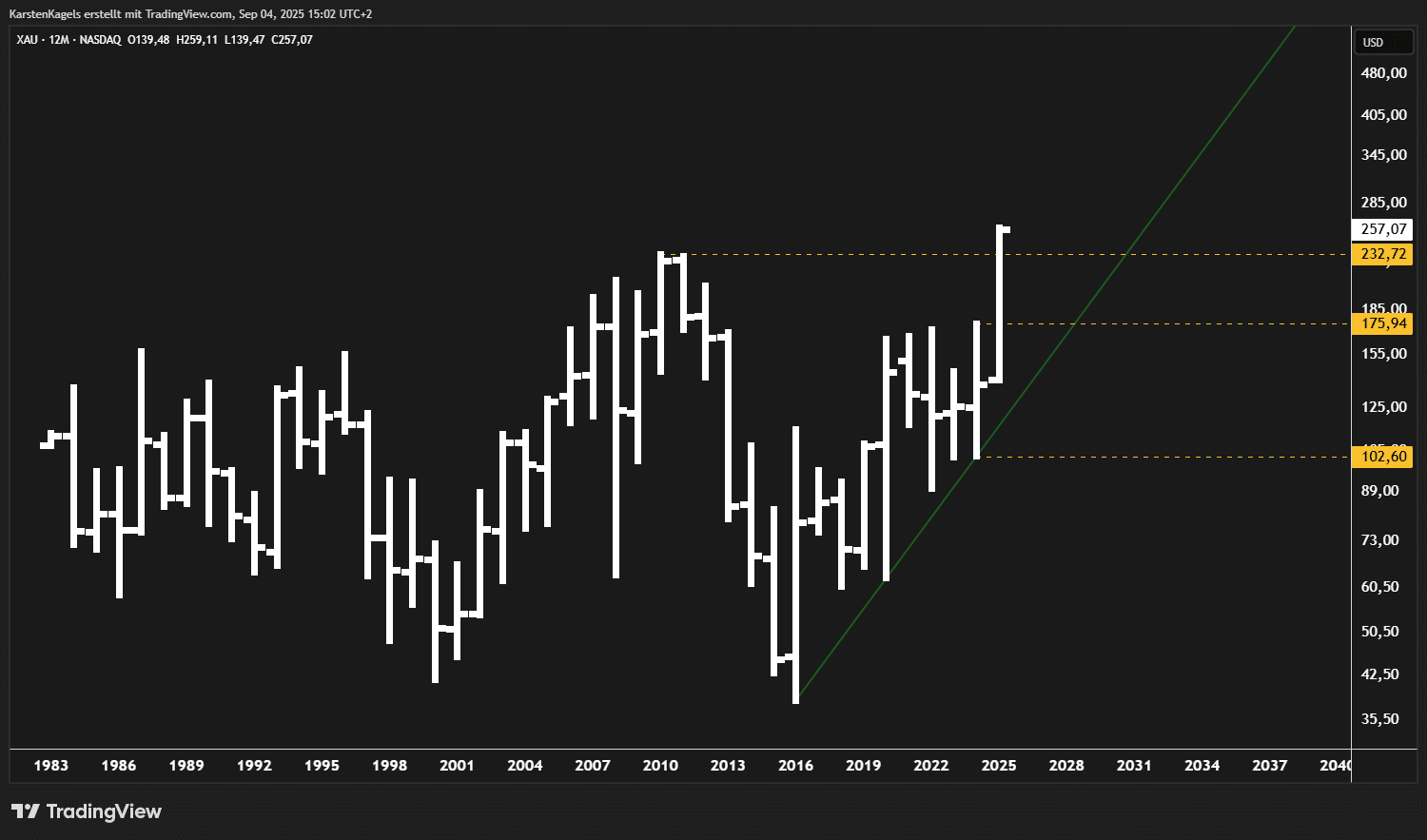 Das laufende Jahr 2025 bildet momentan eine starke Jahreskerze, die mit einem Hoch an der $260er-Marke den Ausbruch auf einen neuen Rekordwert vollzieht. Hier könnte sich Anschlussdynamik zeigen, die bei entsprechender Nachfrage Kursziele im $300er-Bereich anvisieren dürfte.