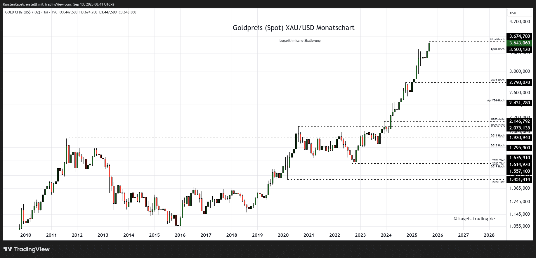 Vom Hoch aus 2020 ist der Goldpreis in eine Korrektur übergegangen, die zunächst eine breite Seitwärtsphase ausgebildet hat. Das Jahr 2022 hat im November ein Tief bei $1.614 markiert, woraufhin bis zum Jahresende noch eine Erholung über $1.800 einsetzen konnte. Im Jahr 2023 wurde diese Dynamik fortgeführt, nach einem Zwischentief bei $1.804 zeigt sich bis in den April 2025 eine starke Aufwärtsbewegung mit einem neuen Allzeithoch bei $3.500. Der bemerkenswerte Anstieg der vorangegangenen Monatskerzen pausiert zunächst, wodurch seit Mai eine Schiebephase über der $3.100er-Marke entstanden ist.
