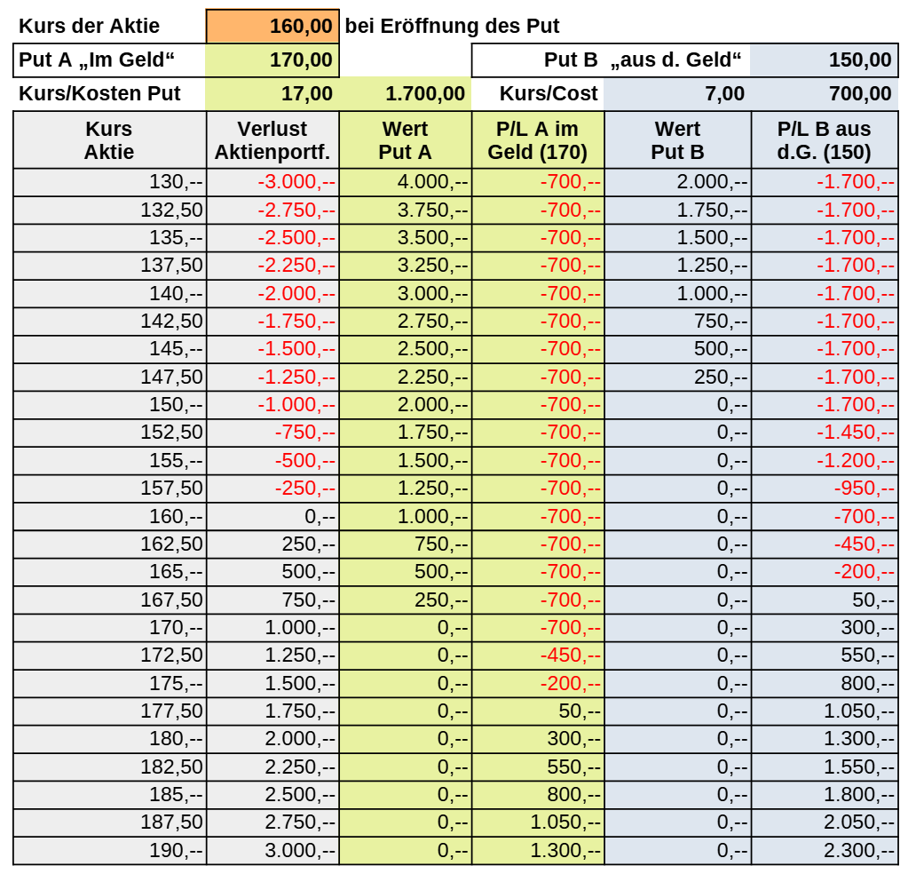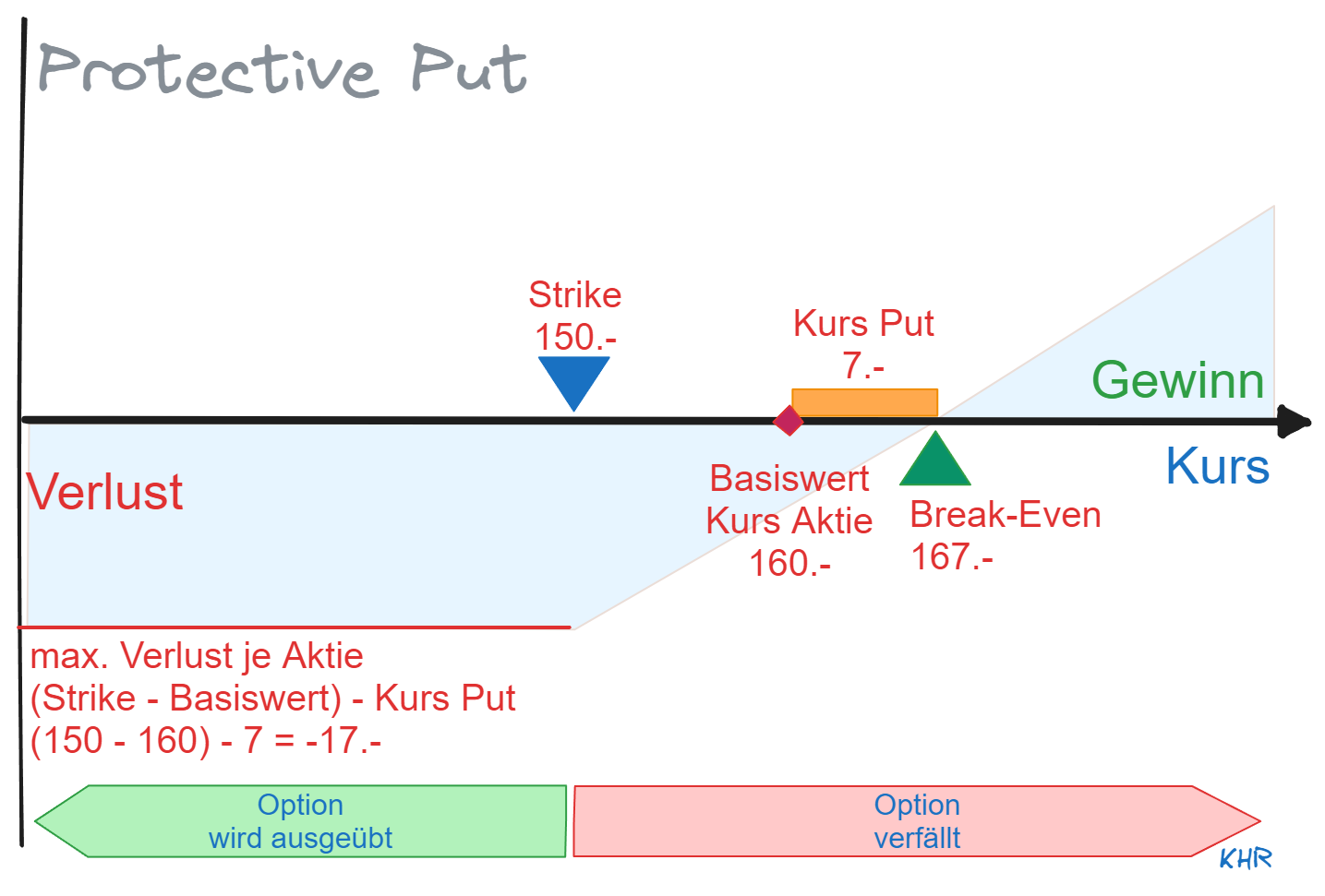 Ein Protective Put ist der Kauf je einer Put-Option auf 100 Aktien im Depot, um sich gegen Kursverluste abzusichern.