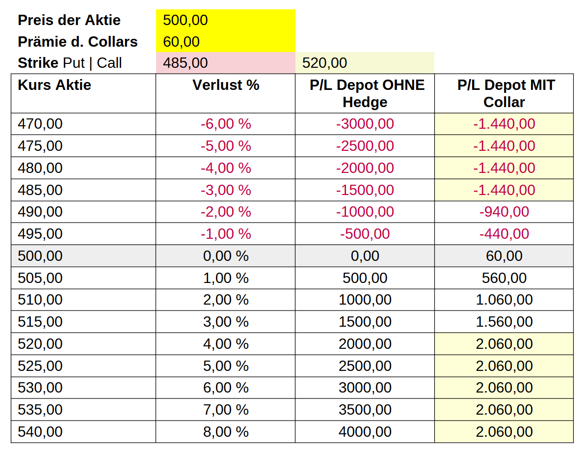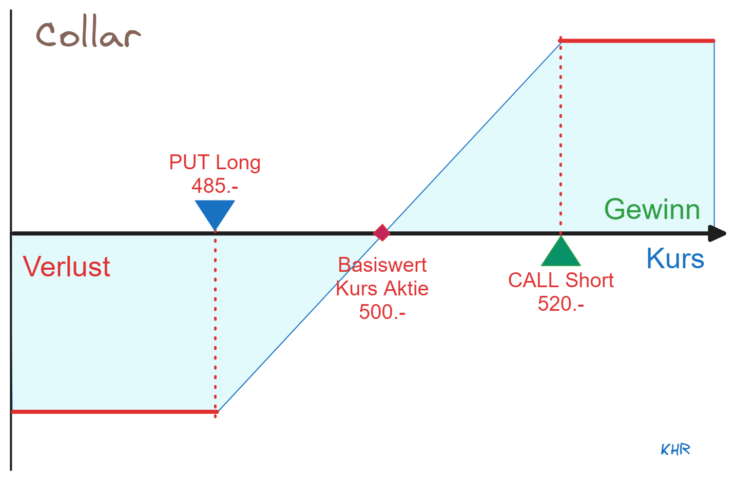 Ein Collar kombiniert einen Covered Call und einen Protective Put, um eine kostenneutrale Absicherung zu erreichen. Die Prämieneinnahme des Covered Call finanziert den Protective Put.