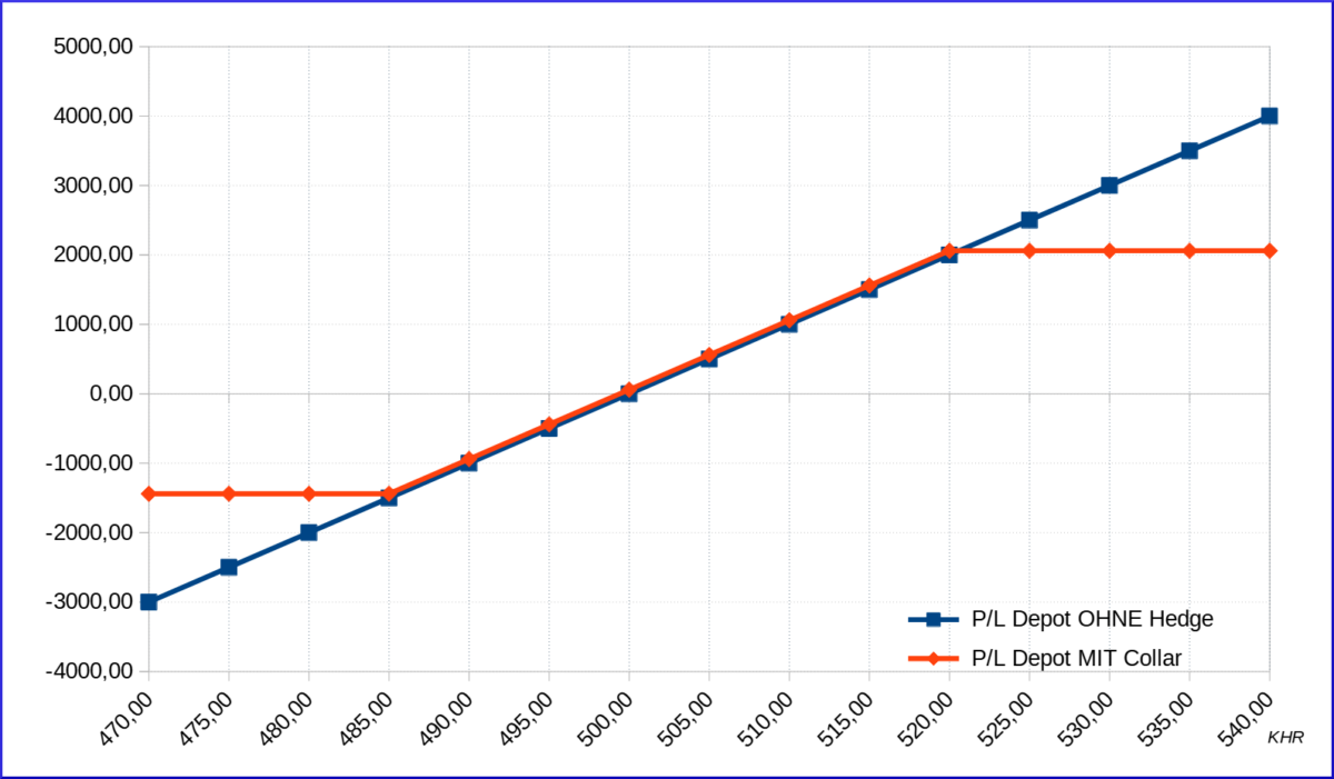 Die negativen Aspekte des Überhedgings zeigen sich also hauptsächlich dann, wenn der Kurs steigt. Zu den direkten Kosten (Ausgaben für Optionsprämien, Verluste aus den Futures-Positionen) gesellen sich noch Opportunitätskosten (ein Großteil des Aufwärtspotenzials wird “verschenkt”).