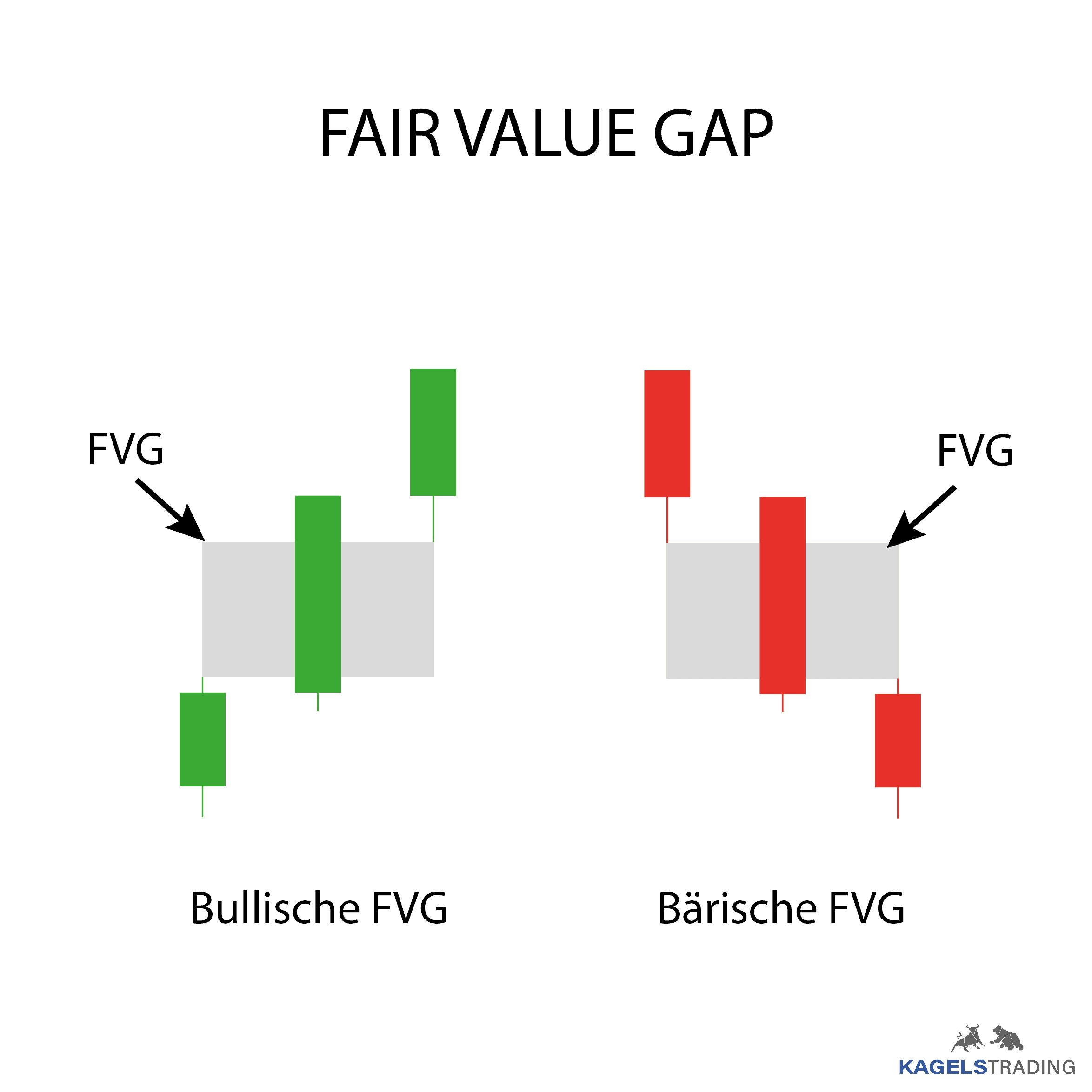Die FVG wird durch eine spezielle dreistufige Kerzenformation auf dem Chart identifiziert. Im Falle einer “bullischen FVG” besteht die Formation aus einer ersten Kerze, gefolgt von einer starken Aufwärtskerze (die zweite Kerze), und schließlich einer dritten Kerze. Das FVG wird zwischen dem Hoch der ersten Kerze und dem Tief der dritten Kerze gebildet. Im Falle eines “bärischen FVG” besteht die Formation aus einer ersten Kerze, gefolgt von einer starken Abwärtskerze (die zweite Kerze), und schließlich einer dritten Kerze. Das FVG wird zwischen dem Tief der ersten Kerze und dem Hoch der dritten Kerze gebildet.