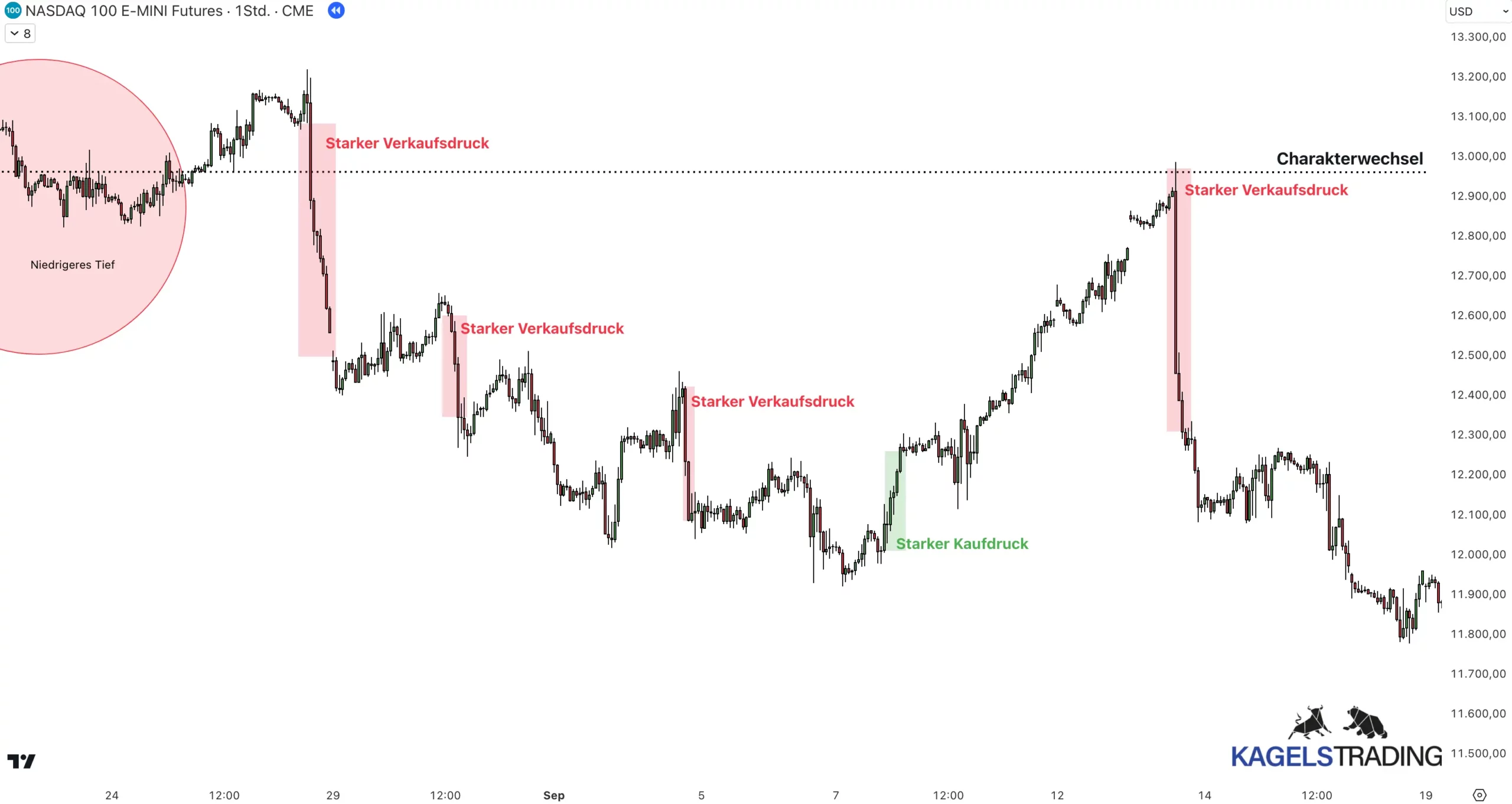 Eine Charakterwechsel liegt dagegen vor, wenn der Kurs ein höheres Tief (in einem Aufwärtstrend) oder ein niedrigeres Hoch (in einem Abwärtstrend) durchbricht. Dies deutet auf eine mögliche Trendwende hin.