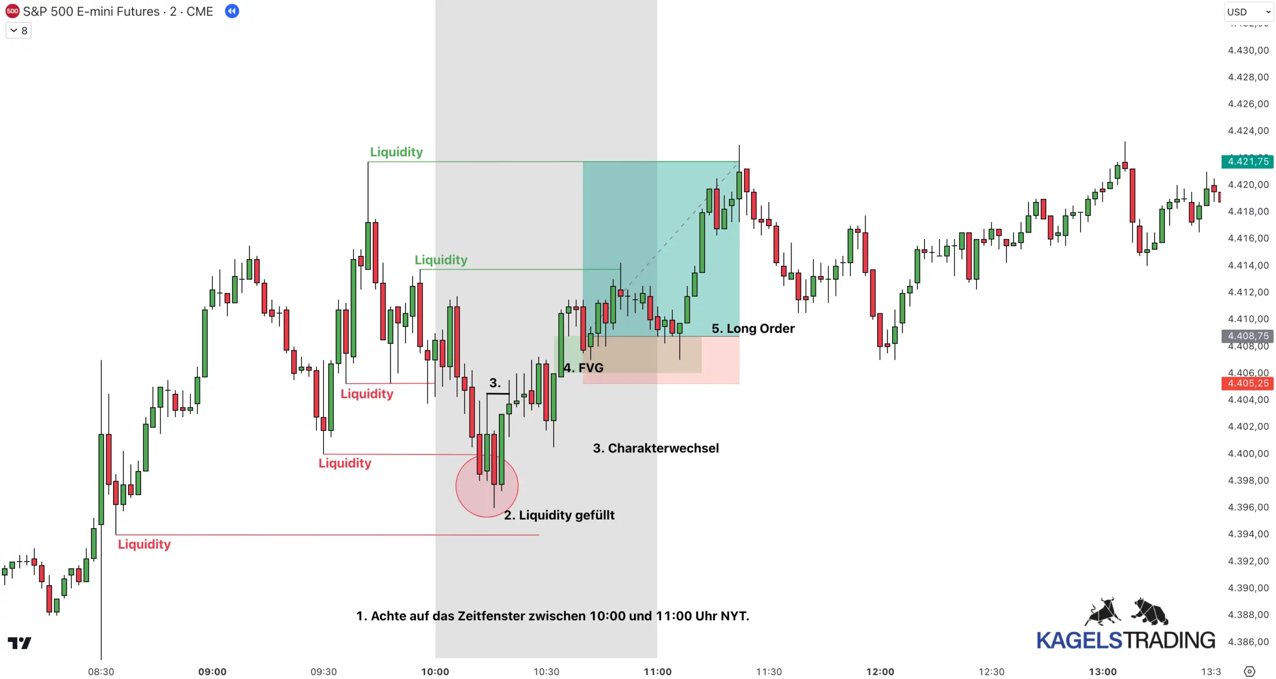 Wir handeln auf der Ein-Fünf-Minuten-Chart (1-5 Minuten-Chart). Wenn das Zeitfenster um 10 Uhr startet, warten wir darauf, dass der Preis die Sell Side Liquidity oder Buy Side Liquidity füllt. Danach warten wir auf einen Charakterwechsel mit Displacement. Hier sollten wir nun unsere Fair Value Gap (FVG) finden.
