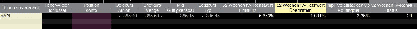Dementsprechende Spalten lassen sich in der TWS einfügen. Daraus lässt sich dann über eine Formel das IVR berechnen. Praktischerweise lässt sich das IVR ebenfalls in der TWS anzeigen. Die Spalten habe ich für das Beispiel einmal eingefügt, um die Formel herzuleiten: