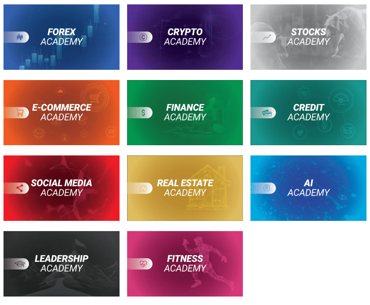 • Die Akademie bietet Schulungen in den Bereichen Gesundheit, Forex-Trading, Online-Business und Mindset.