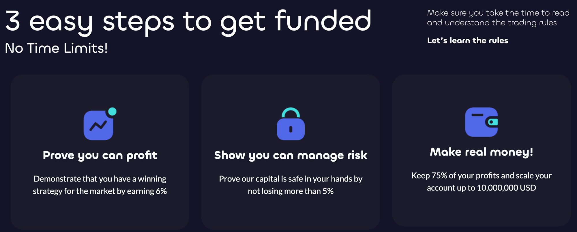 Im Großen und Ganzen bin ich von den Funktionen beeindruckt, die Lux Trading Firm bietet. Zunächst einmal finde ich es toll, dass man in nur sechs Schritten bis zu einem Handelsvolumen von 10 Millionen Dollar aufsteigen kann; diese Funktion ist unglaublich einzigartig, da viele Prop-Firmen nicht einmal eine halbe Million erreichen.