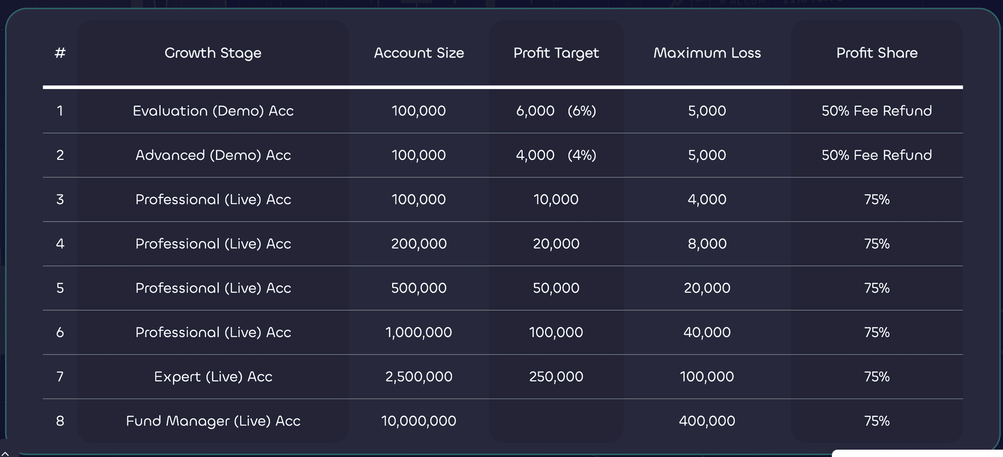 Für jede Kontogröße gibt es einen Skalierungsplan (Karriereplan) von Lux Trading, der es ermöglicht, bis zu 10.000.000 $ zu handeln. Je nach Kontotyp müssen 5 bis 7 Stufen durchlaufen werden, um die größtmögliche Handelssumme zu erreichen.