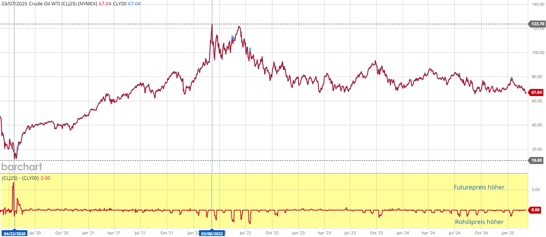 Chart mit Vergleich zwischen Rohöl (WTI) Preis und Futures (CL) Preis.
