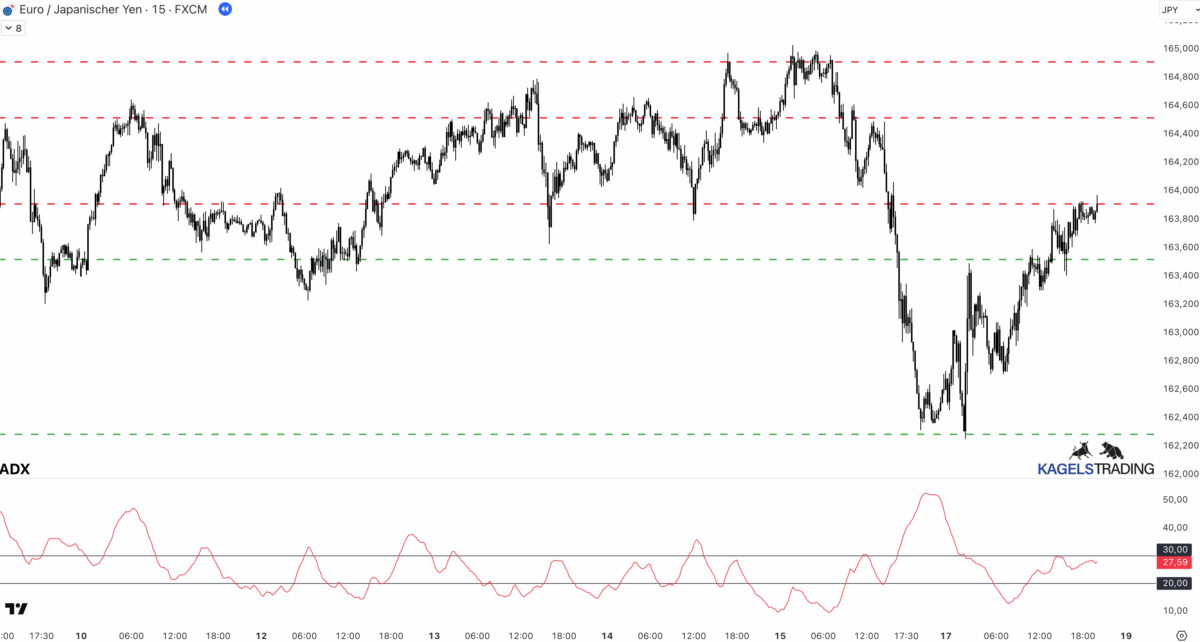 ADX unter 20 zeigt sehr schwache Trends und ist ideal für Range Trading. ADX zwischen 20-25 bedeutet schwacher Trend, Range Trading ist noch möglich.