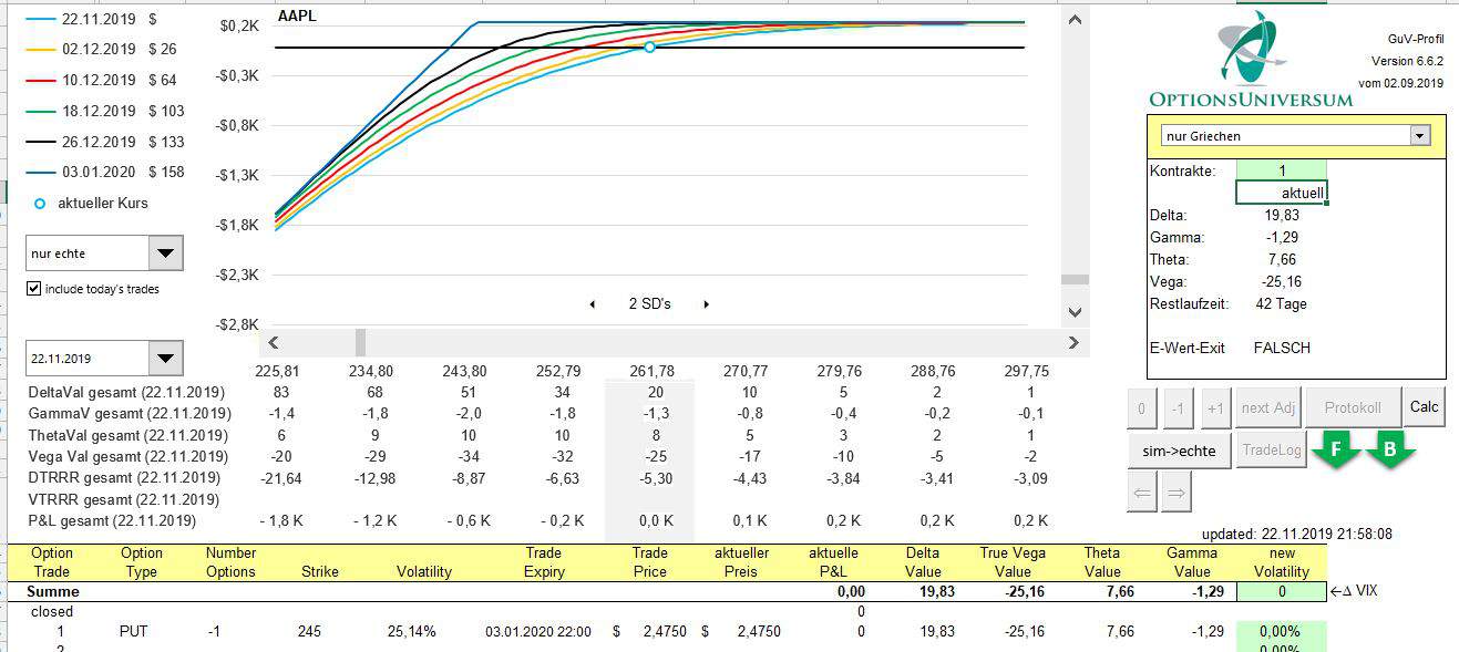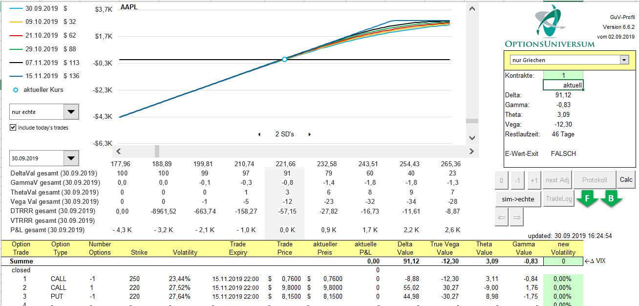 Zur Darstellung im GuV Profil habe ich die Aktienposition synthetisch eingerichtet. Dies wird durch einen gekauften Call und einen verkauften Put erreicht. Die Strikes liegen dabei nächstmöglich am Geld und ergeben in der Summe ein Delta von 100. Diese Position verhält sich dann eins zu eins wie ein Trade in 100 Aktien. Die Prämie für den verkauften Call senkt den Breakeven. (Aktienkurs minus Prämie > $ 221,66 – 0,76 = $ 220,90)