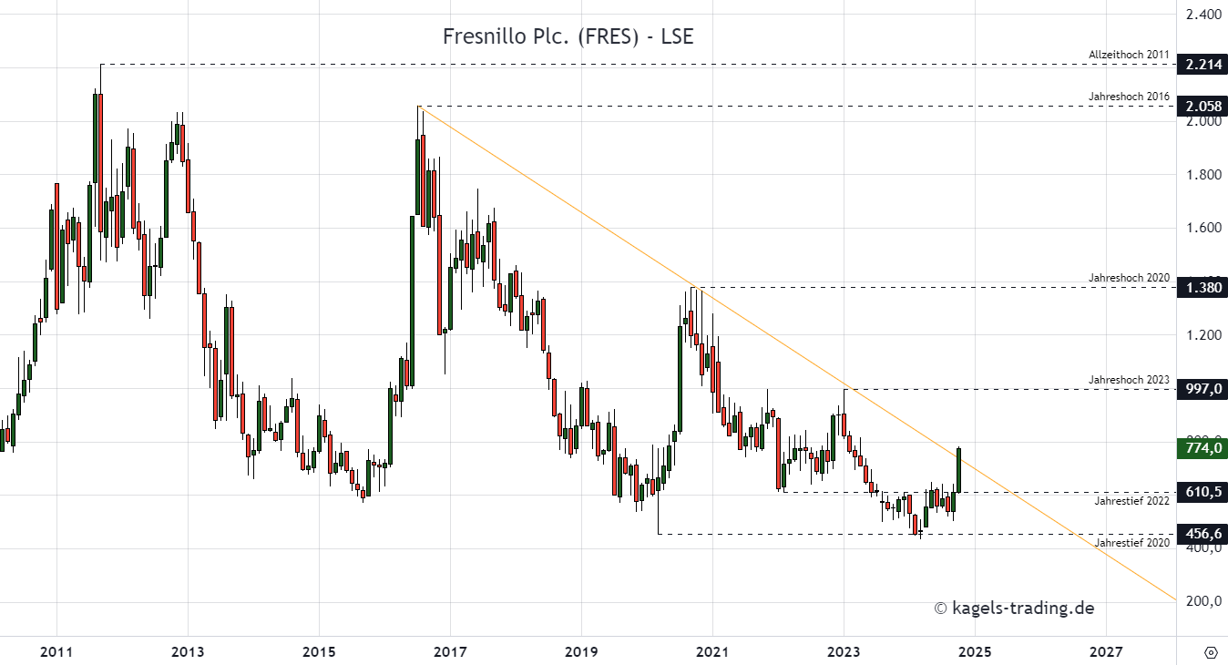 Der Ausbruch aus dem unteren Bereich der Preisspanne bietet sich für ein Langfrist-Investment geradezu an. Mit seinen hohen Kapazitäten und Ressourcen kann Fresnillo steigende Silberpreise direkt in bare Münze umwandeln und seinen Gewinn steigern. In der Zone um 500 GBX liegt ein Unterstützungsbereich. Konservative Trader warten noch eine Bestätigung des Ausbruchs durch einen Re-Test am 2022er Jahrestief beziehungsweise bei anhaltender Dynamik den Pullback an die orangefarbene Abwärtstrendlinie ab.