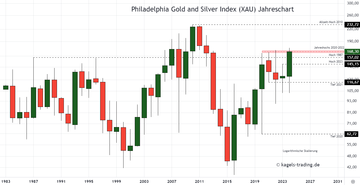 Dieser an der Nasdaq-Börse geführte Index enthält 30 Minenaktien aus der Gold- und Silberminenindustrie und wurde am 19.01.1979 mit einem Basiswert von $100 aufgesetzt. Die Charttechnik kann hier besonders interessant sein, da Ausreißer einzelner Werte im Gesamtbild relativiert werden.