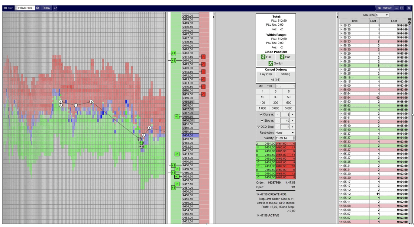 Die stabile Anbindung über die Hochgeschwindigkeitsschnittstelle ETS an XETRA und EUREX sorgt für unübertroffene Schnelligkeit im Order-Routing. The GRID eröffnet Futureshändlern auch neue strategische Möglichkeiten: Die Markthistorie wird durch eine grafische Darstellung intuitiver zugänglich und erleichtert intuitive Handelsentscheidungen. Hier ein Screenshot dazu