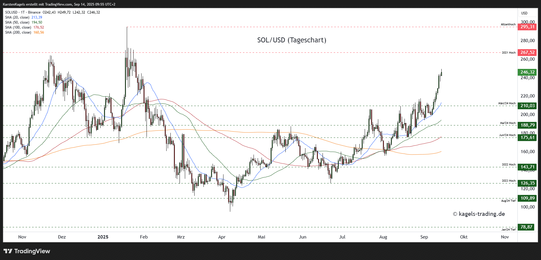 Mittelfristige Prognose: Mit dem Ausbruch über das 2023er-Hoch konnte das Chartbild von Solana seinen positiven Ausblick stärken und Notierungen über dem Hoch aus 2021 erreichen. Nach einem neuen Rekordwert bei $295 ist der Kurs jedoch in die Konsolidierung zurückgekommen.