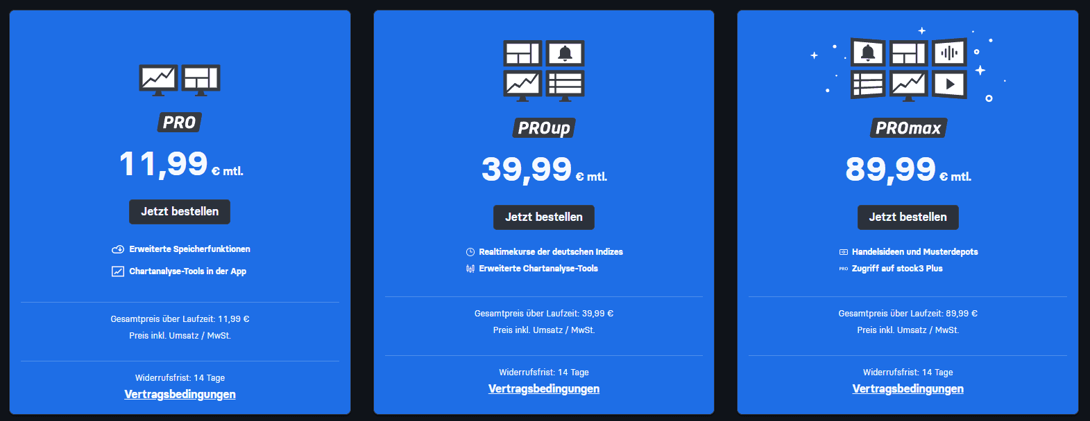 Die Kosten für die stock3-PRO-Pakete hängen davon ab, für welche Variante und für welche Laufzeit du dich entscheidest.