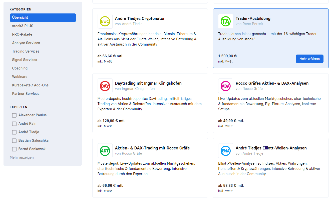 Für alle Trading Neulinge stehen im stock3 Store zudem zahlreiche Trading-Services zur Auswahl, die man auf Wunsch jederzeit dazubuchen kann. Dabei handelt es sich entweder um Analyse-, Trading- und Signal-Services oder um eine komplette Trading Ausbildung (bei Rene Berteit).