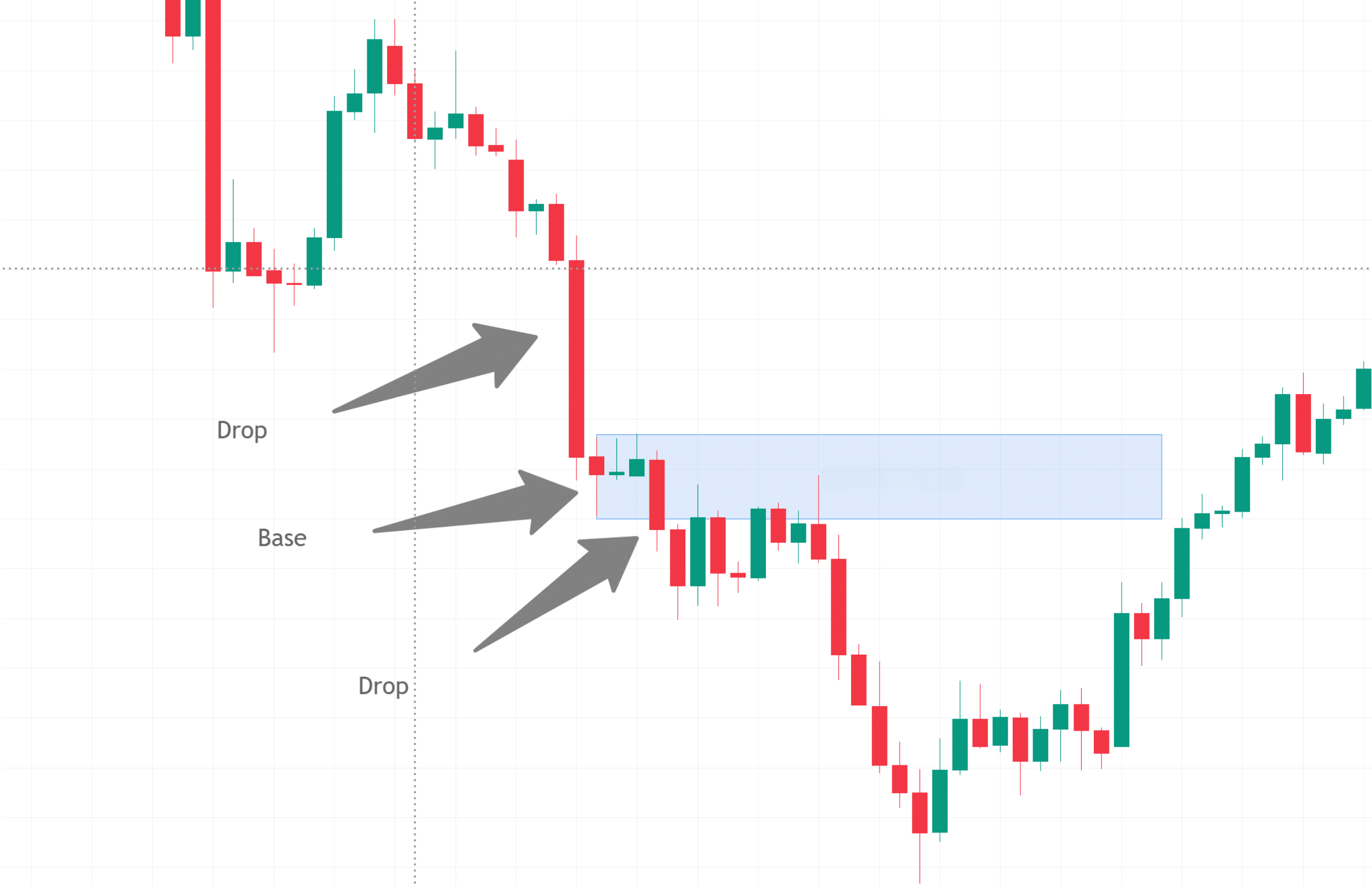 Auf einen schnellen Anstieg folgt eine Base, dann ein scharfer Abverkauf. Die Zone markiert den Punkt, an dem Verkaufsdruck überwiegt.✔️ Drop-Base-Drop (DBD):