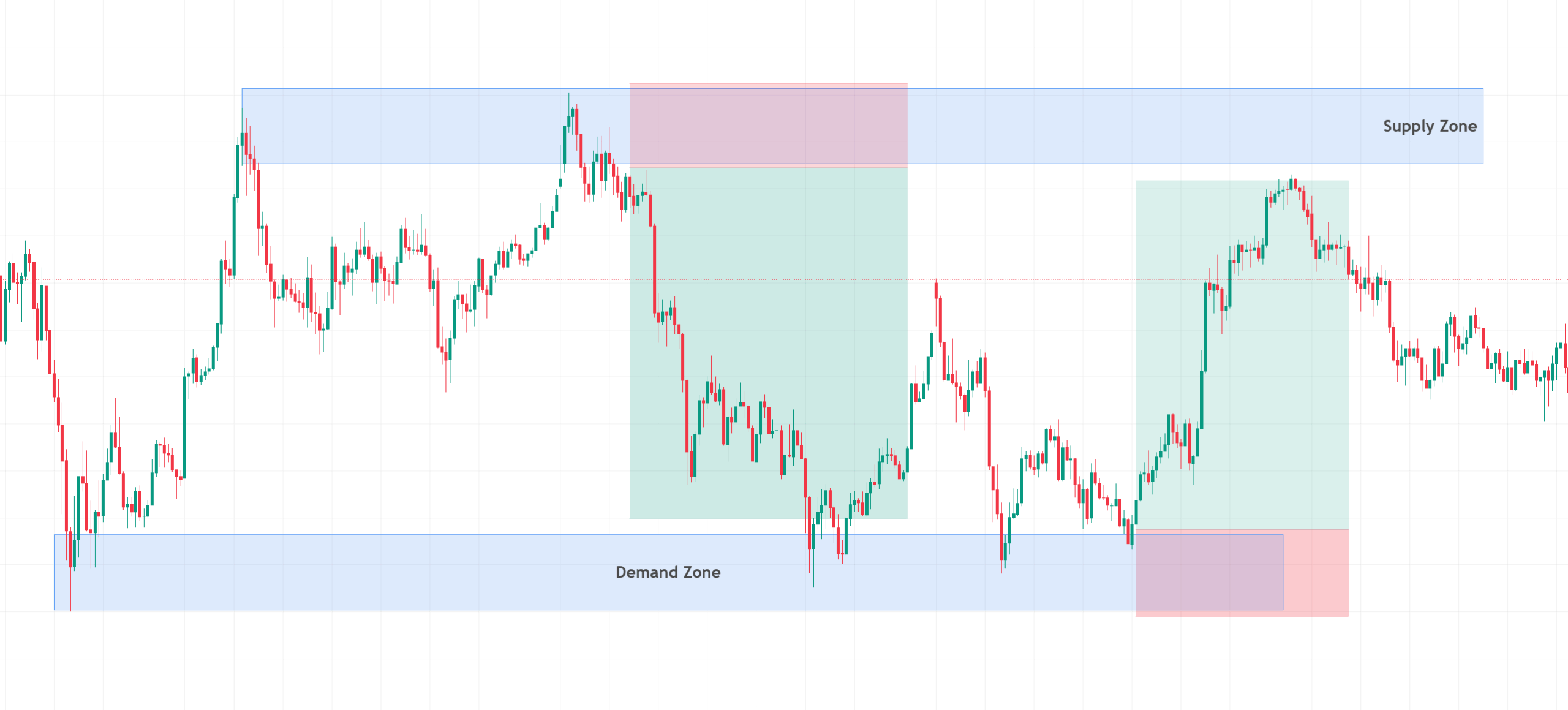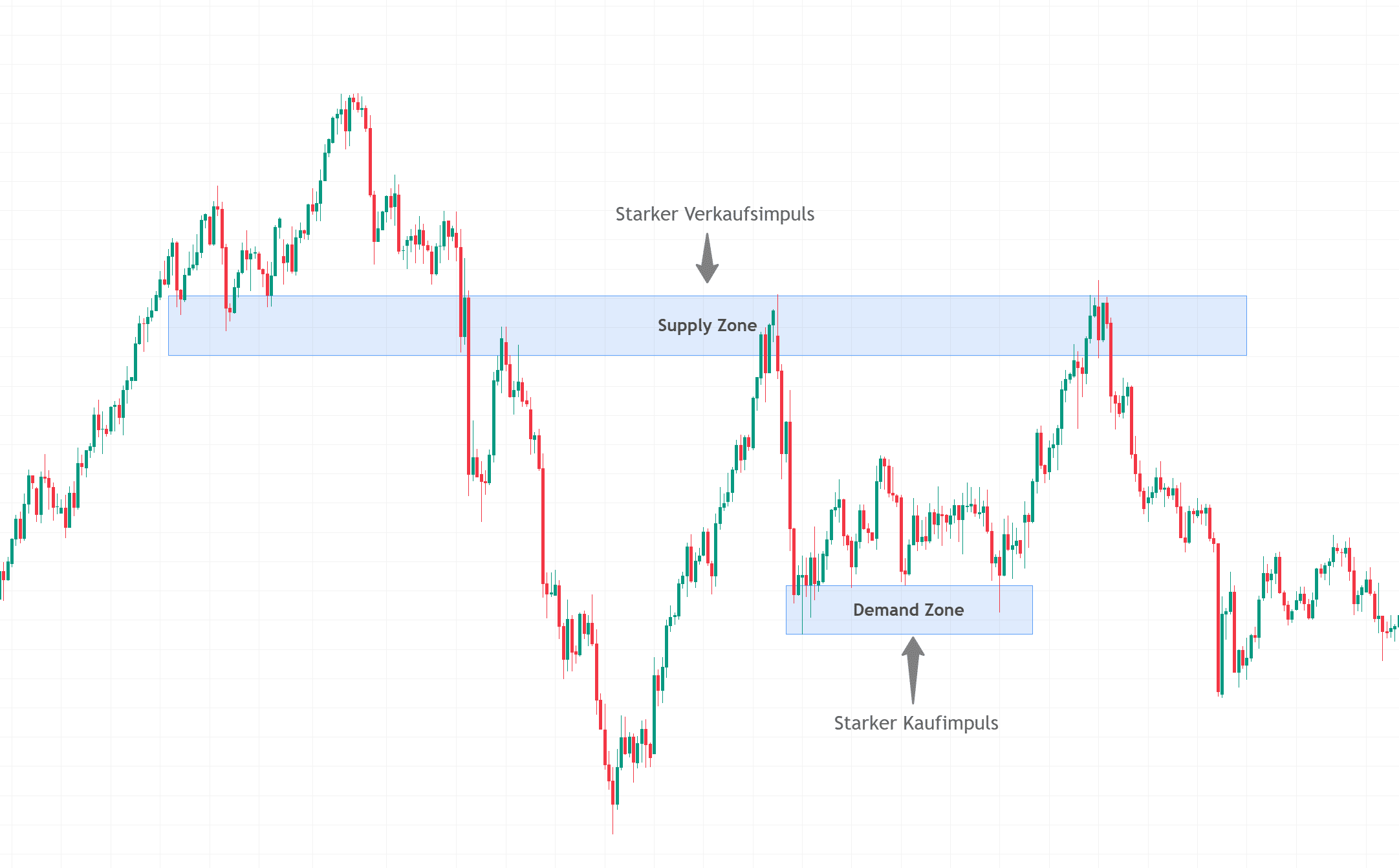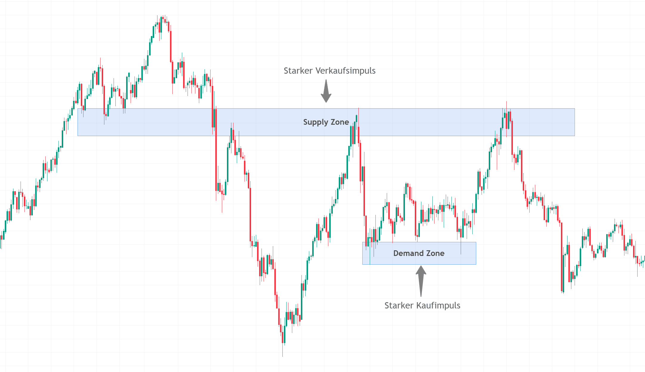 - Prinzip: Beim Supply and Demand Trading geht es darum, Zonen im Chart zu erkennen, in denen Angebot und Nachfrage stark aus dem Gleichgewicht geraten sind.