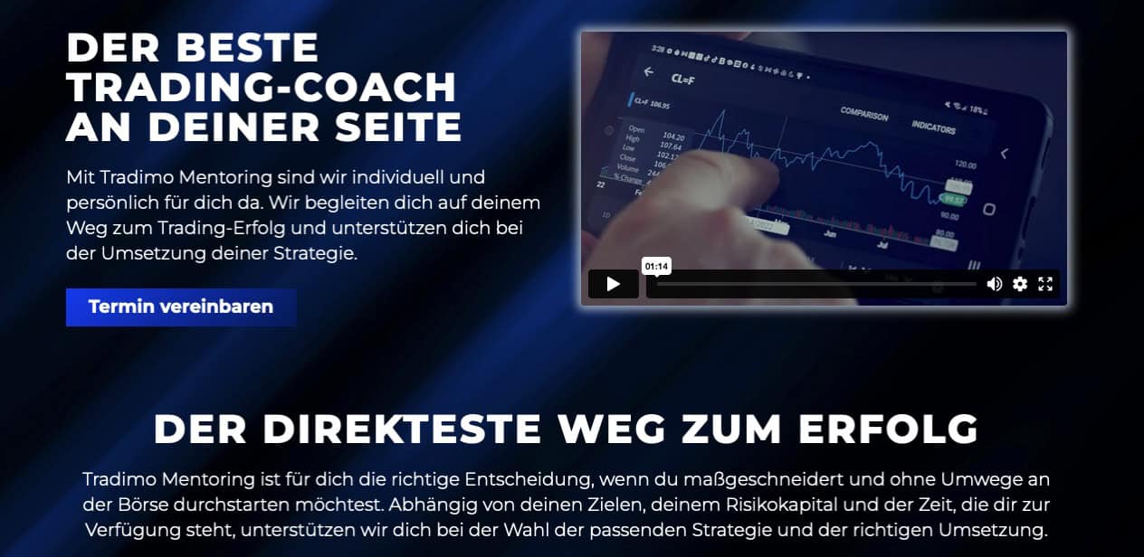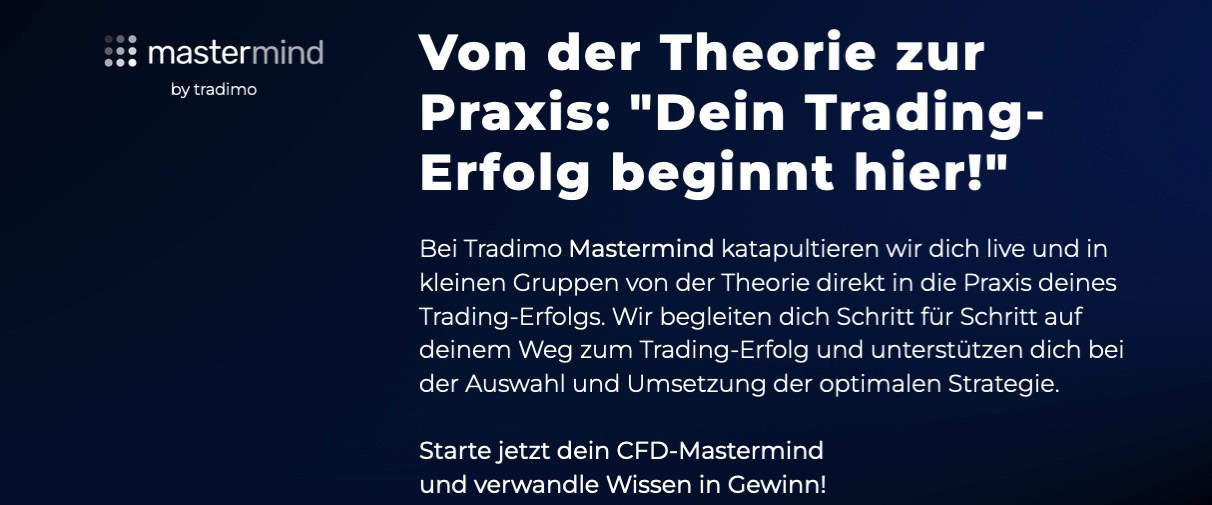 - Angebote sind: Tradimo Mastery, Tradimo Mastermind, Tradimo Mentoring für Anfänger bis fortgeschrittene Trader