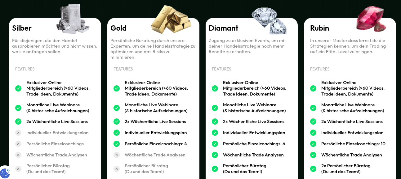 TradingFreaks: Das Top Trader Programm ist kein Seminar, sondern ein Onlineprogramm. Es kostet ab 166 Euro pro Monat. Dieses Programm umfasst eine umfassende 6-wöchige Ausbildung mit täglichem Support, Videokursen und Trade-Ideen. Es gibt verschiedene Pakete wie Silber, Gold und Diamant.