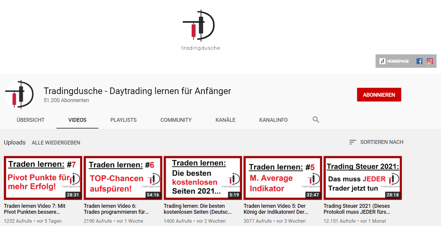 Neben dem YouTube Kanal betreibt Tradingdusche darüber hinaus noch einige weitere Social Media Kanäle. Auf dem Facebook Tradingdusche Kanal werden in der Woche 1-2 Beiträge veröffentlicht. Diese beinhalten in der Regel jedoch nur die aktuellen YouTube Beiträge, welche hierdurch noch mehr Menschen erreichen sollen. Der Instagram Account hingegen dient zum Zeitpunkt der Betrachtung nicht dem Tradinggeschehen.