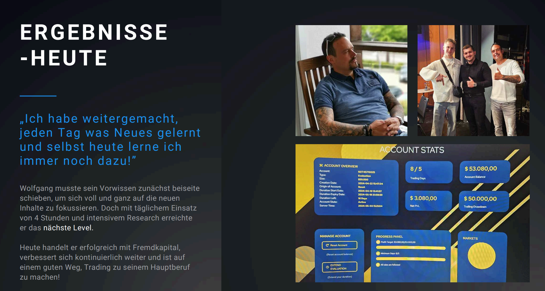 Einige Absolventen berichten sogar, dass sie durch TRALGO den Sprung zum Prop-Funding geschafft haben – ein klares Zeichen dafür, dass hier nicht nur Theorie vermittelt wird, sondern echte Trader-Performance im Fokus steht.