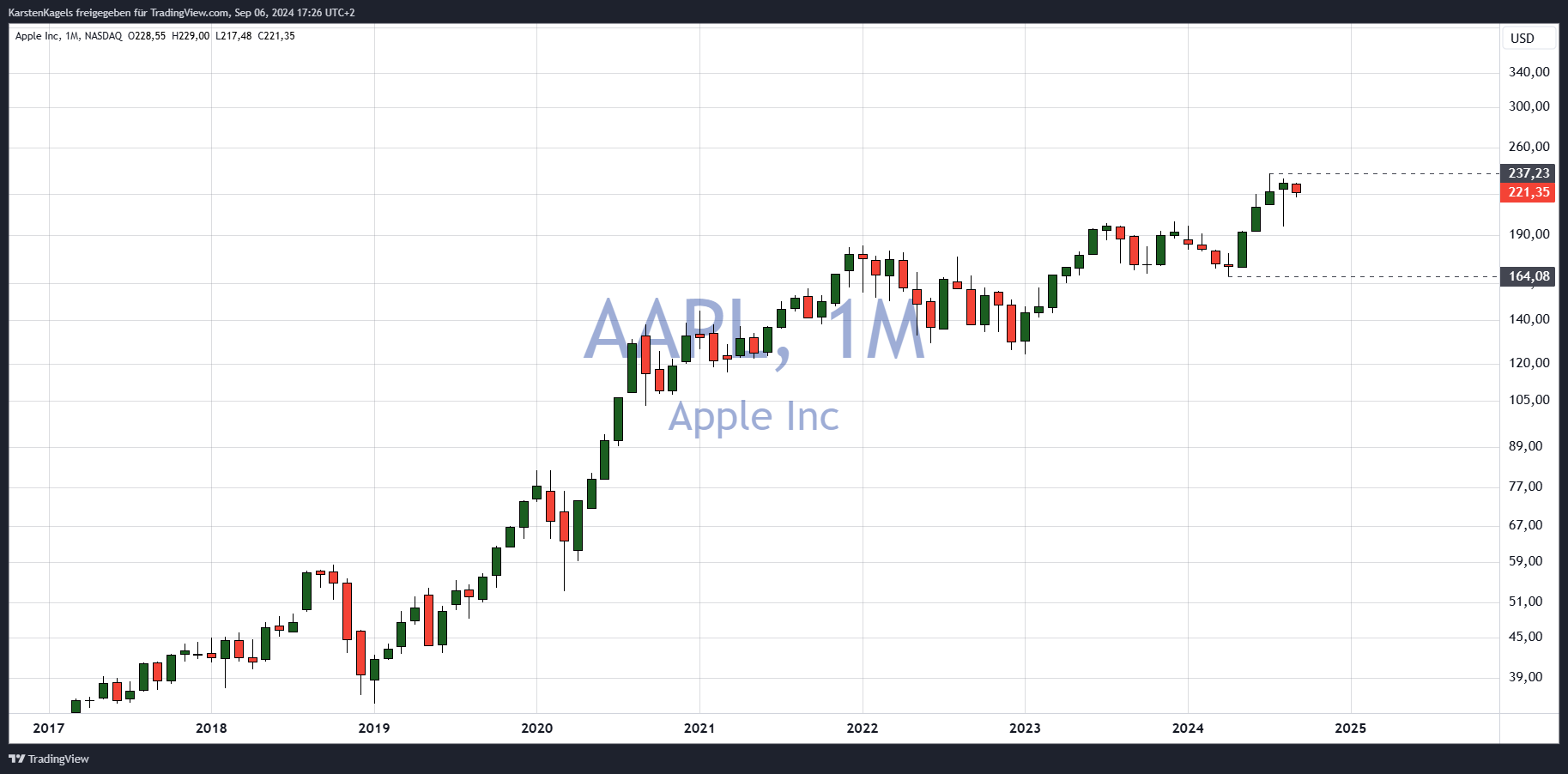 Apple Aktie im Monatschart – intakter Aufwärtstrend (Quelle: TradingView)