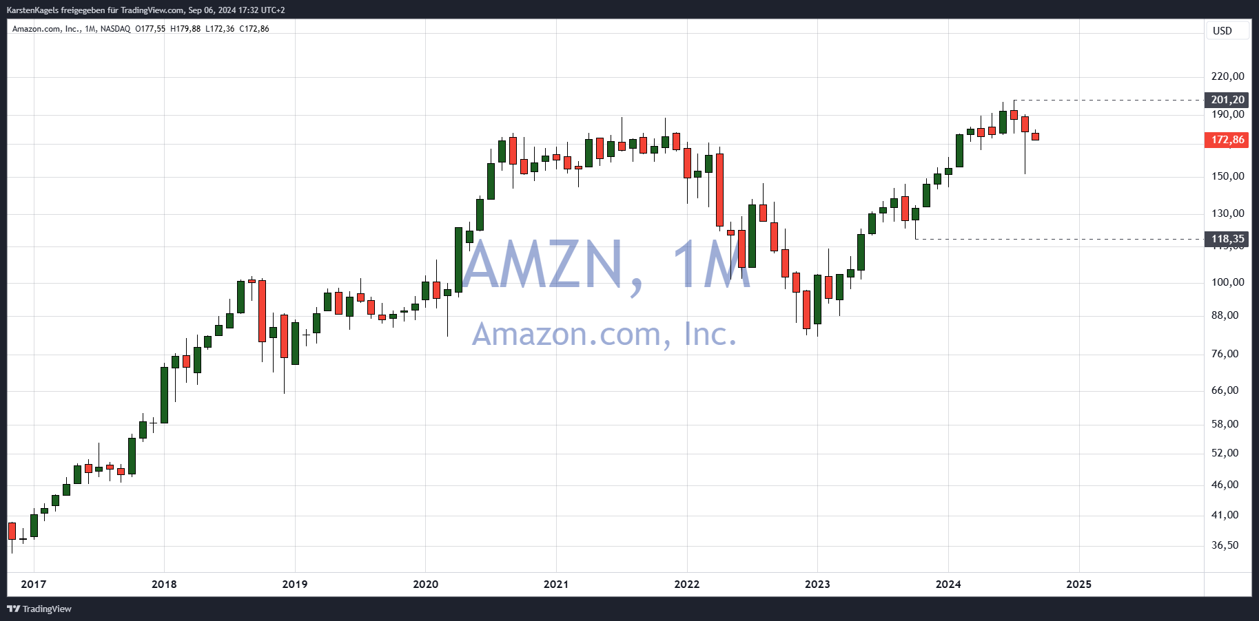 Amazon Aktie im Monatschart – intakter Aufwärtstrend (Quelle: TradingView)
