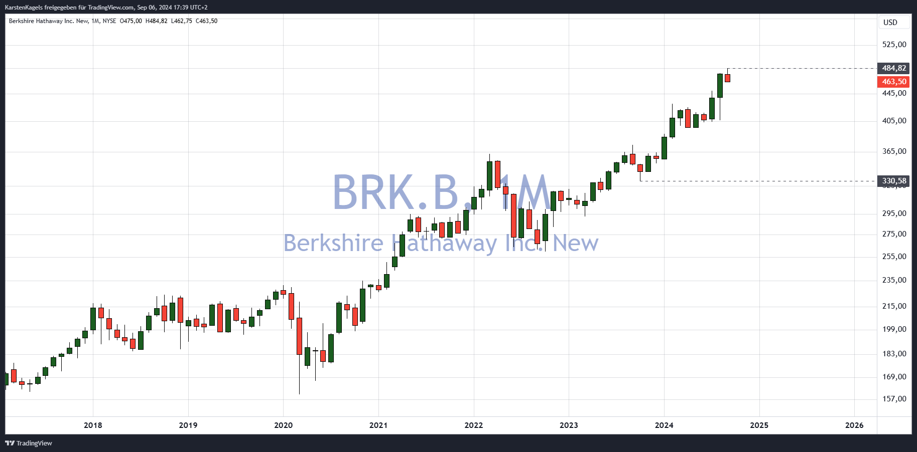Berkshire B Aktie im Monatschart – intakter Aufwärtstrend (Quelle: TradingView)