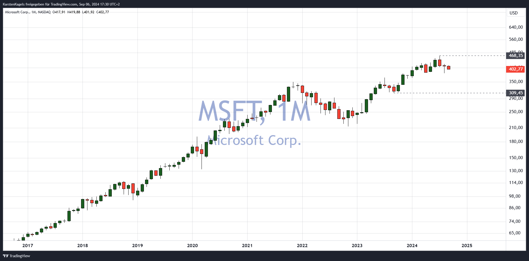 Microsoft Aktie im Monatschart – intakter Aufwärtstrend (Quelle: TradingView)