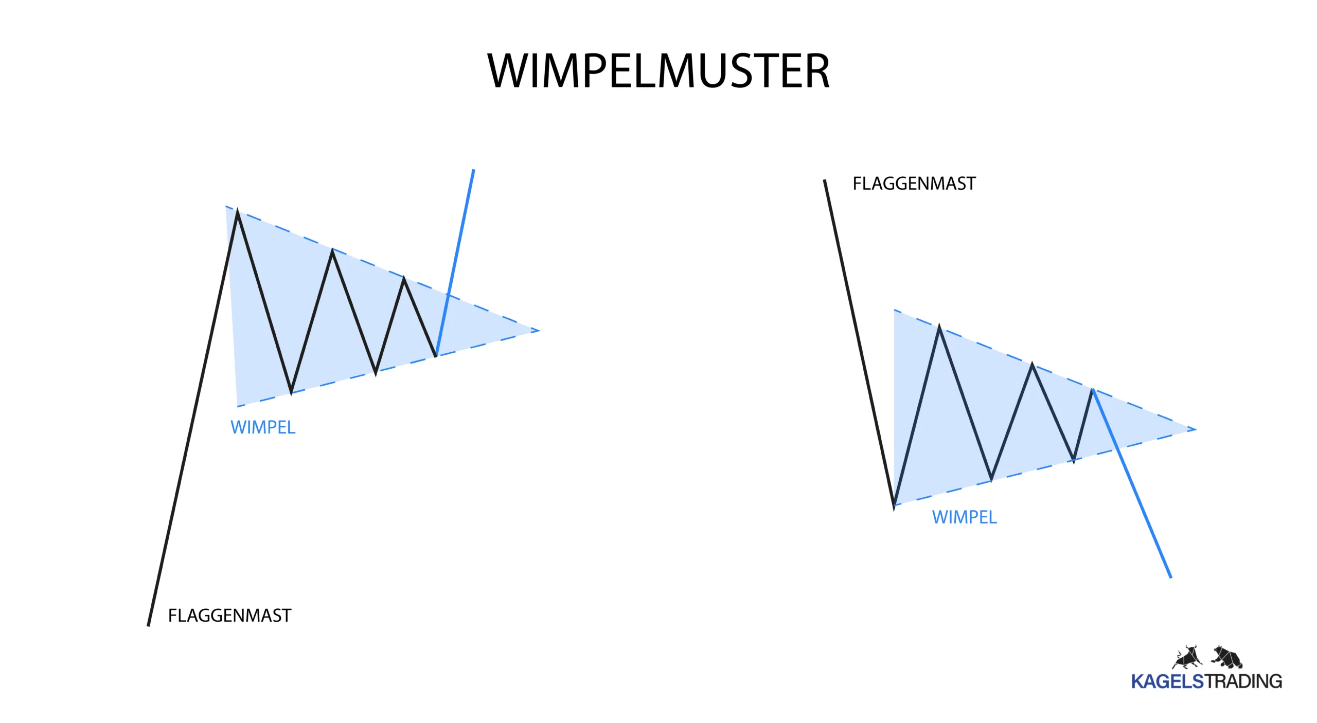 In der obigen Grafik ist auf der linken Seite das bullische Wimpelmuster (bullish pennant) zu sehen. Dieses Muster tritt in einem Aufwärtstrend auf, und der Ausbruch erfolgt nach oben, was die Fortsetzung des Aufwärtstrends bedeutet. Rechts in der Grafik ist das bärische Wimpelmuster (bearish pennant) zu erkennen, das in einem Abwärtstrend entsteht. Hier erfolgt der Ausbruch nach unten, was eine Fortsetzung des Abwärtstrends signalisiert.